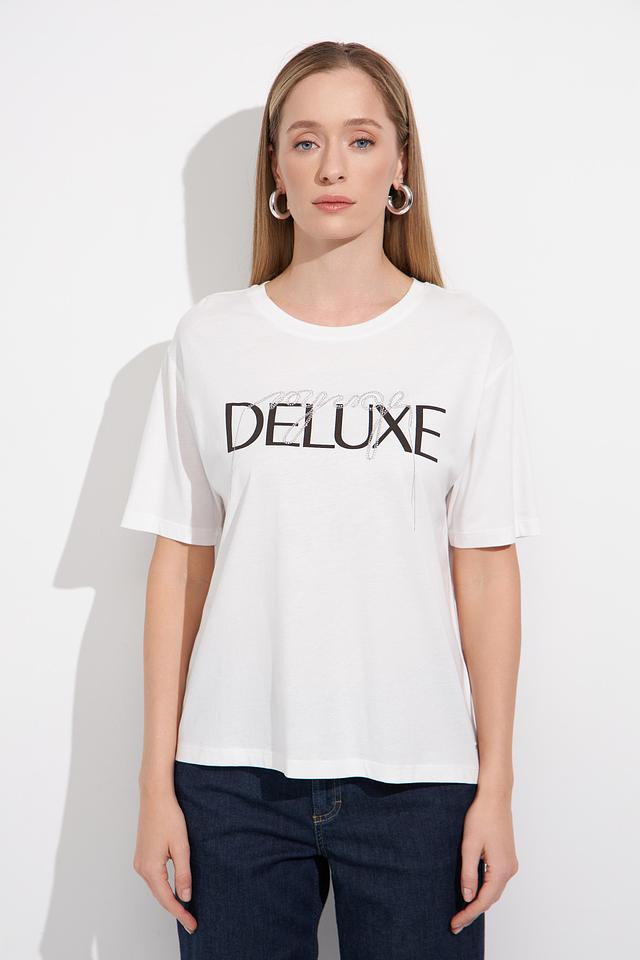 Белая футболка Monari с надписью "DELUXE" — стильная и комфортная базовая вещь. Изготовлена из мягкого хлопка с модалом, обеспечивающего приятные ощущения на коже и отличную посадку. Состав: хлопок 50%, модал 50%