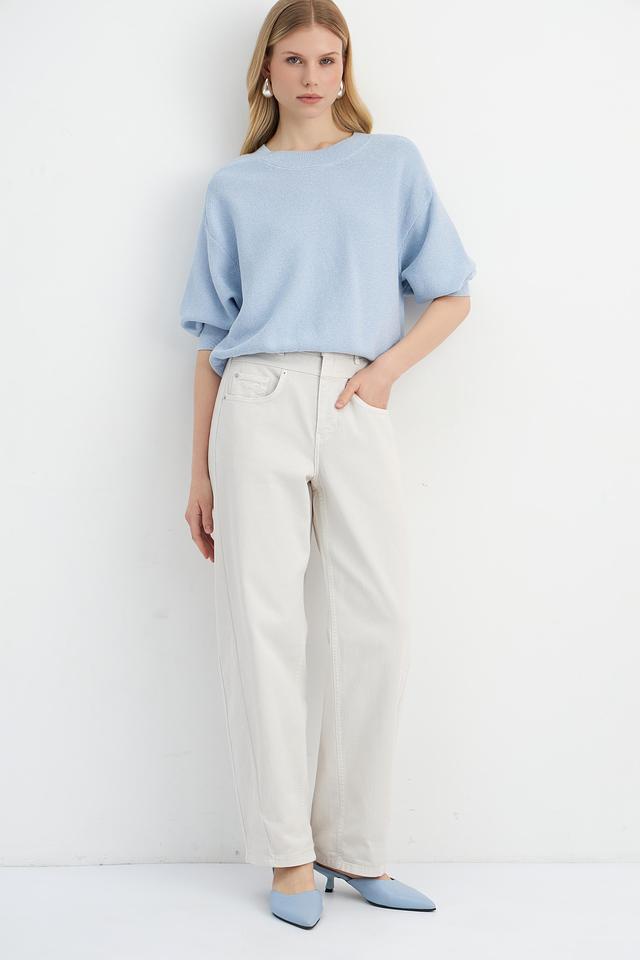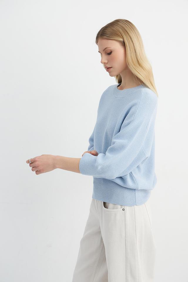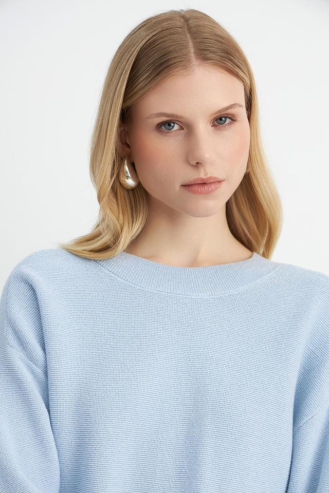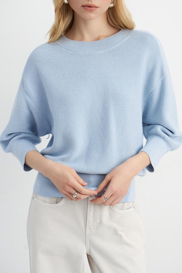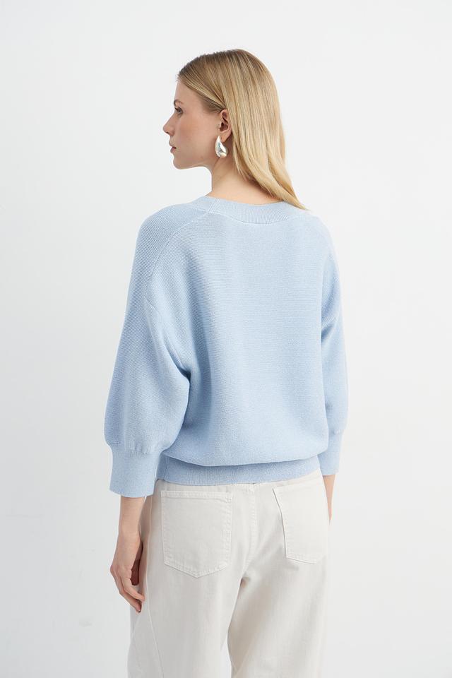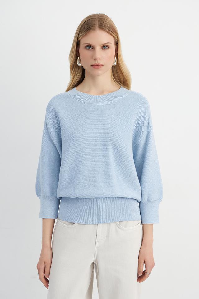 Пуловер имеет прямой крой, округлый вырез горловины и рукав три четверти, что делает его универсальным для различных образов. Нежный голубой цвет добавит свежести и легкости вашему стилю.
