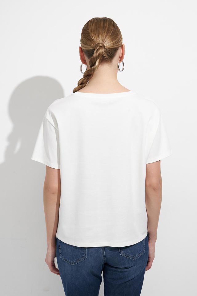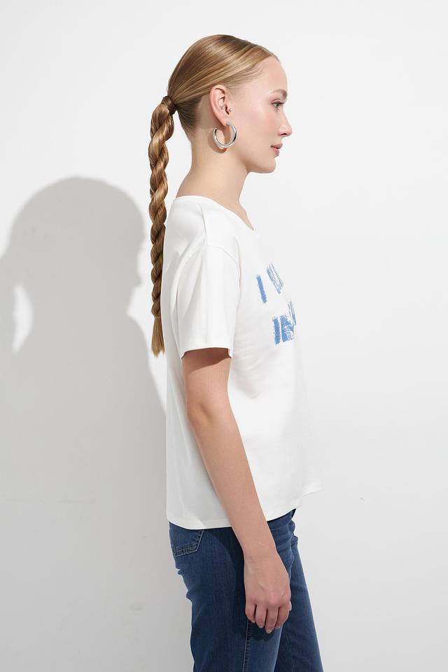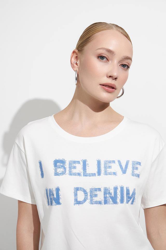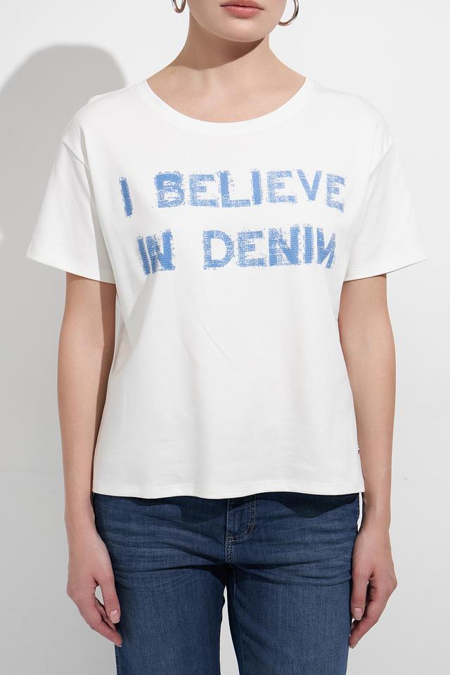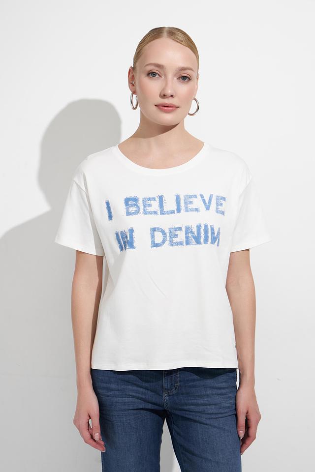 Эта стильная футболка от Monari выполнена в белом цвете и украшена ярким принтом "I BELIEVE IN DENIM". Модель имеет прямой крой и круглый вырез горловины, что делает ее универсальной и подходящей для различных типов фигуры.
