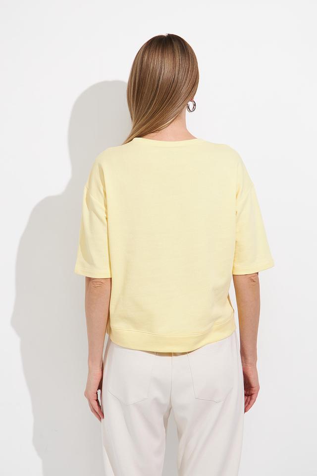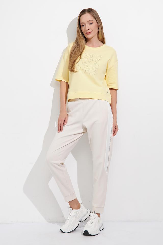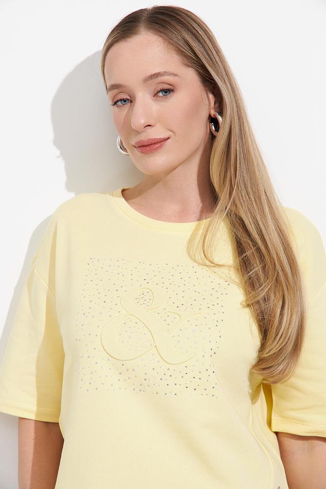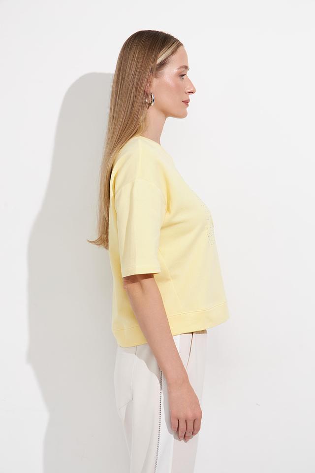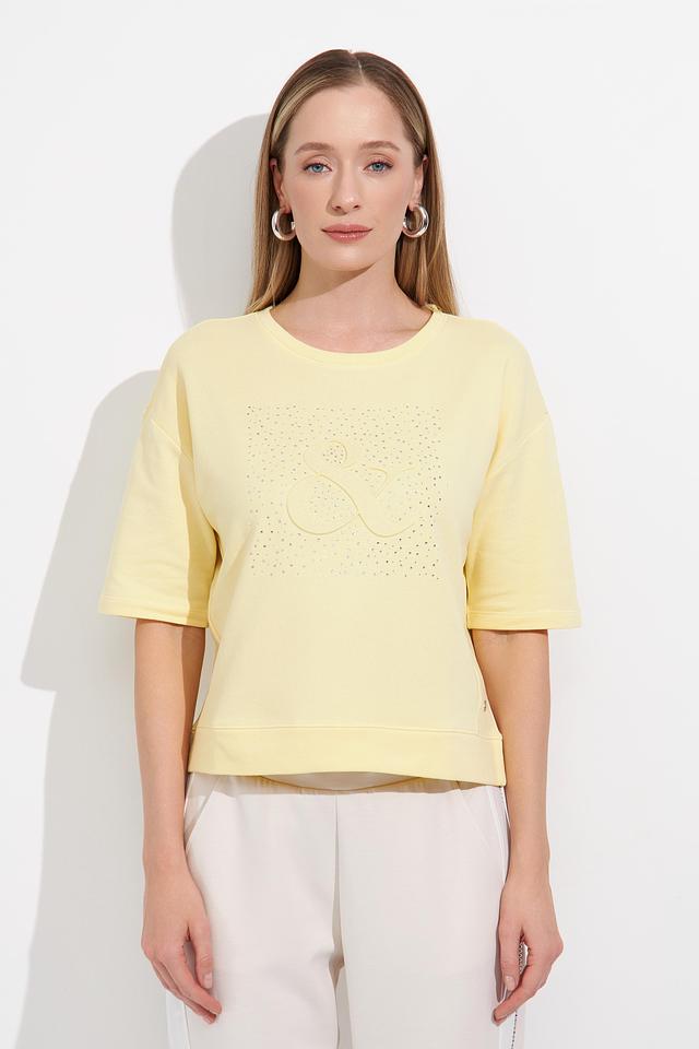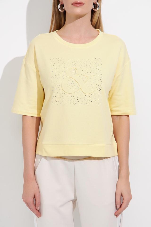 Жёлтый пуловер Monari с короткими рукавами украшен декоративной вышивкой из кристаллов. Модель свободного кроя из мягкого хлопка идеально подойдёт для создания комфортных и стильных образов. Состав: хлопок 100%