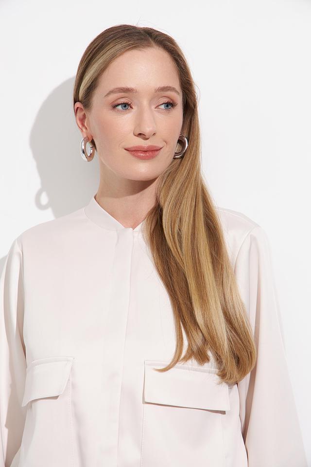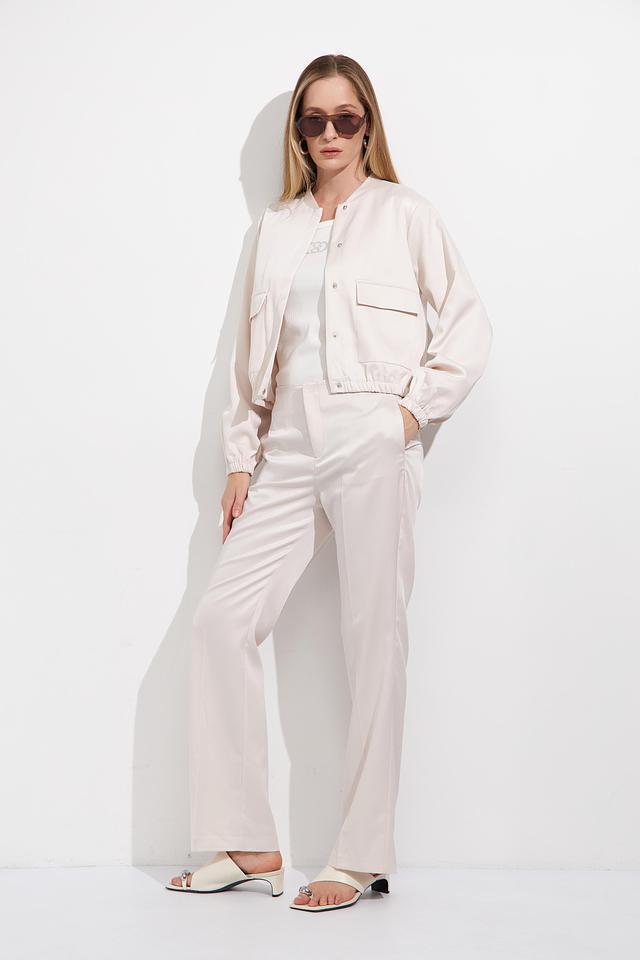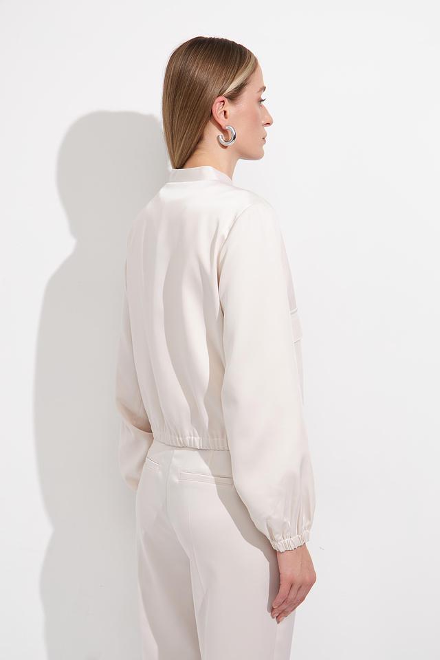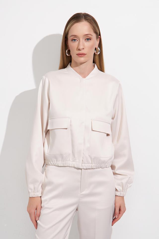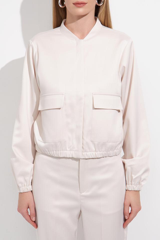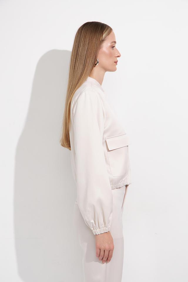 Жакет застегивается на пуговицы, имеет воротник-стойку и два накладных кармана на передней части. Рукава слегка расклешены к низу и имеют манжеты на резинке, что обеспечивает комфортную посадку.