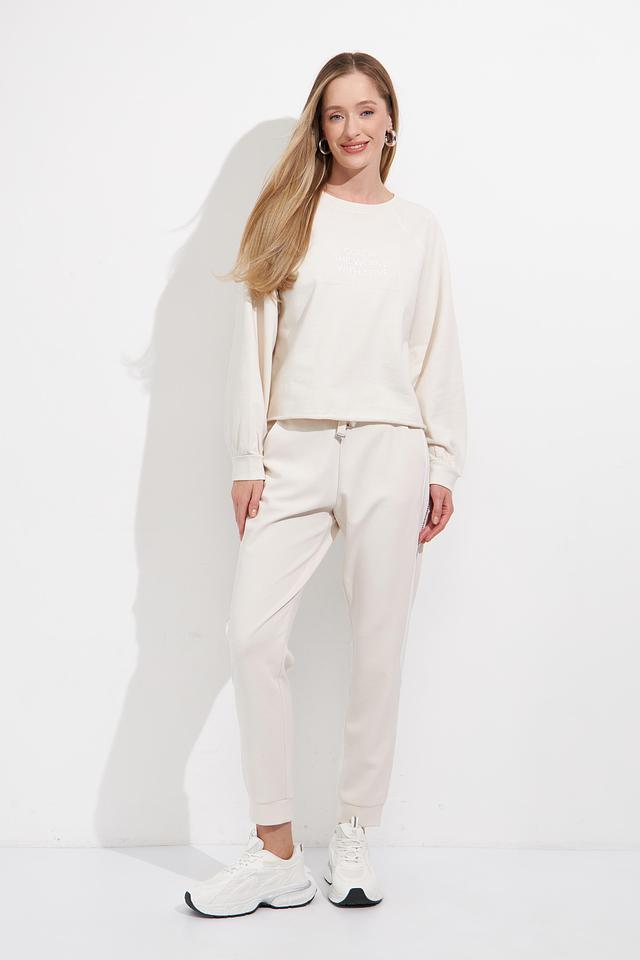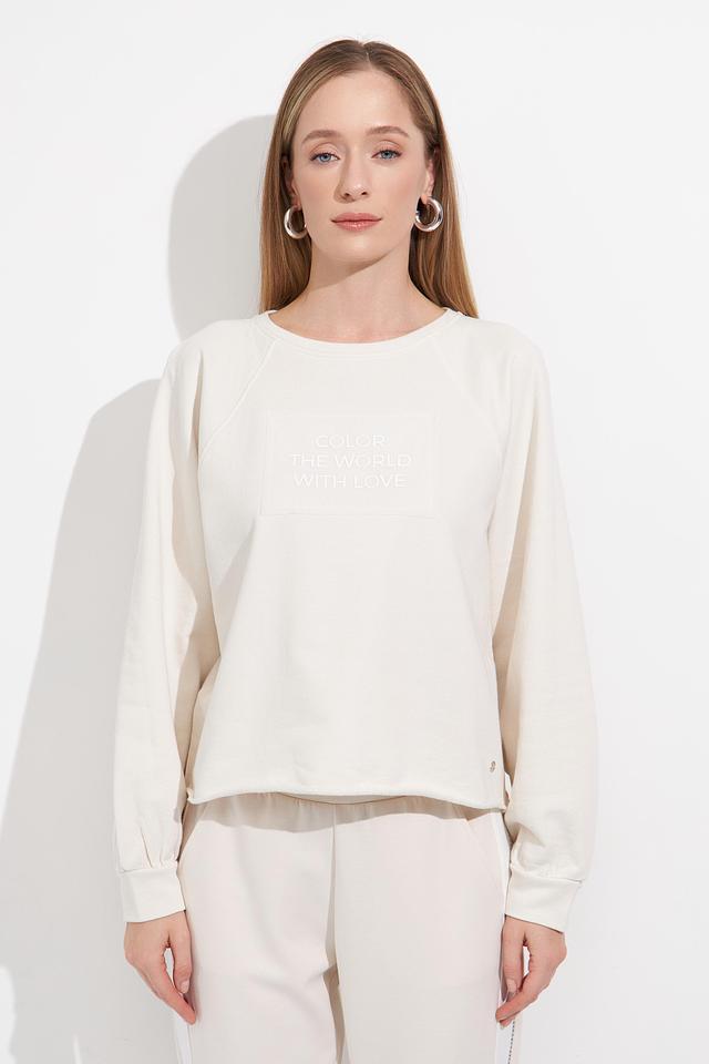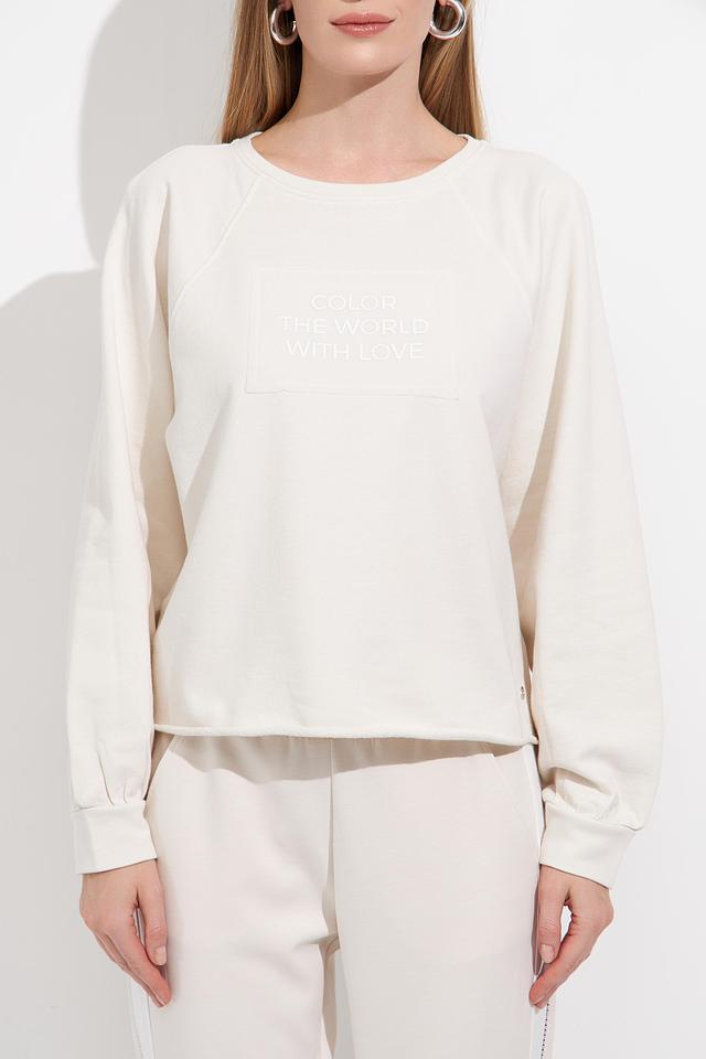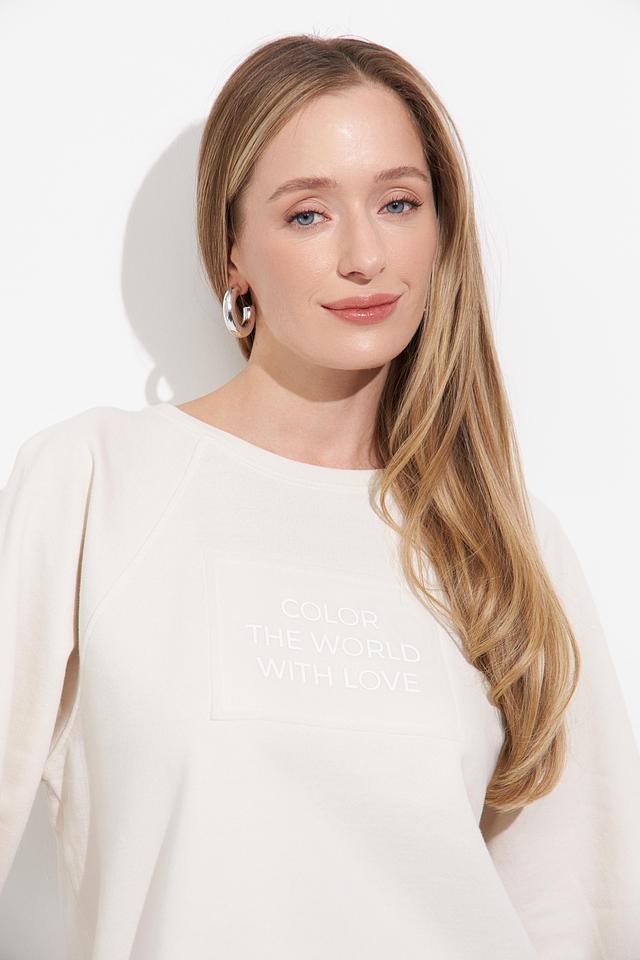 Пуловер украшен стильным принтом с надписью "COLOR THE WORLD WITH LOVE", добавляющим образу индивидуальность. Вырез горловины – округлый, классический. Длинные рукава слегка спущены, что придает модели расслабленный вид.