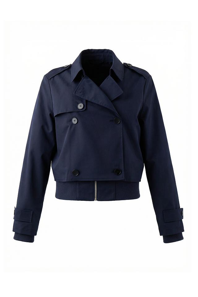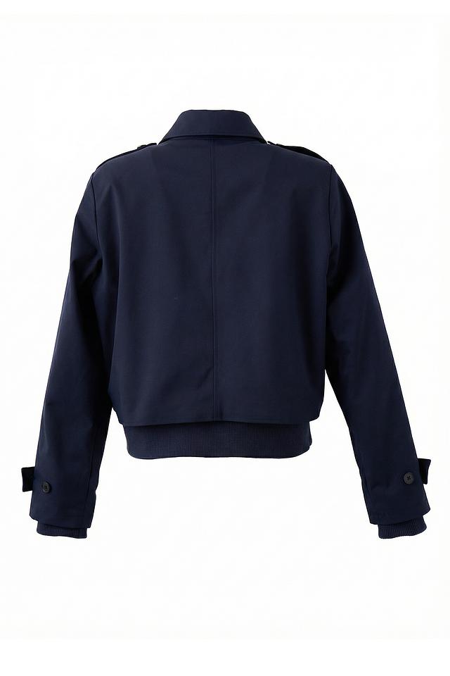 Куртка имеет двубортную застежку на пуговицы, воротник и лацканы. На плечах расположены декоративные погоны. Укороченный крой подчеркивает талию и создает стильный силуэт. Манжеты и нижняя часть куртки отделаны эластичной резинкой с красной полоской, что добавляет динамичности образу.