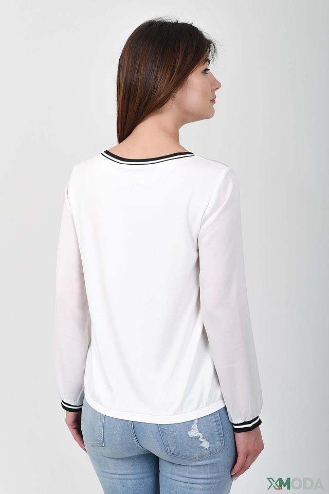 Модель имеет прямой крой, длинные рукава и круглый вырез горловины, который оформлен чёрной тесьмой. Рукава также декорированы чёрной полосой по краю. Блуза выполнена из 100% полиэстера, что обеспечивает легкость и комфорт в носке.