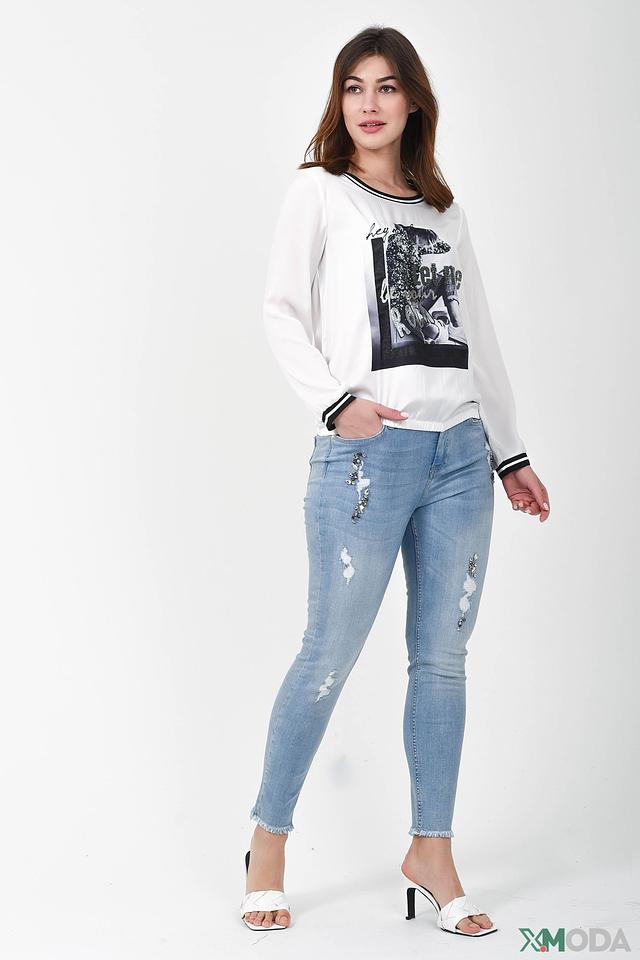Эта стильная блуза от Monari станет отличным дополнением к вашему гардеробу. Блуза выполнена в белом цвете и украшена крупным принтом с надписью "Rock me" и изображением гитары.