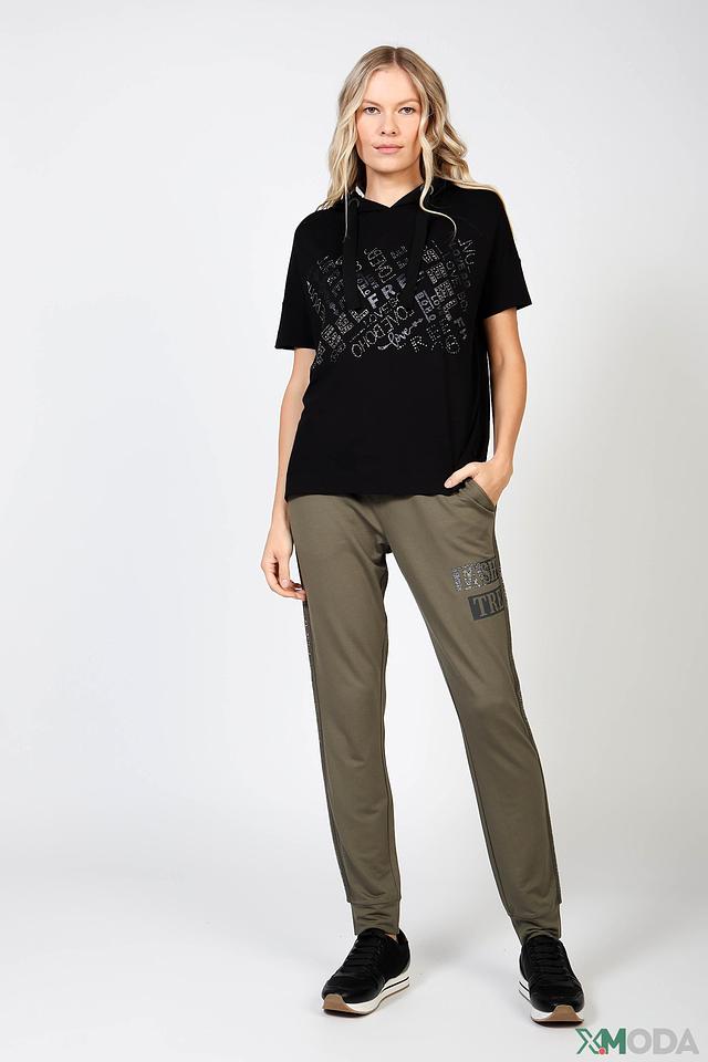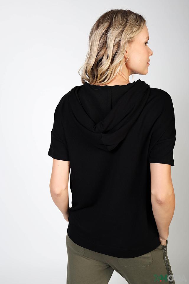 Чёрная футболка Monari с коротким рукавом и капюшоном, украшенная принтом с надписями. Изготовлена из мягкого и приятного к телу сочетания модала и вискозы, с добавлением эластана для комфортной посадки. Состав: модал 45%, вискоза 45%, эластан 10%