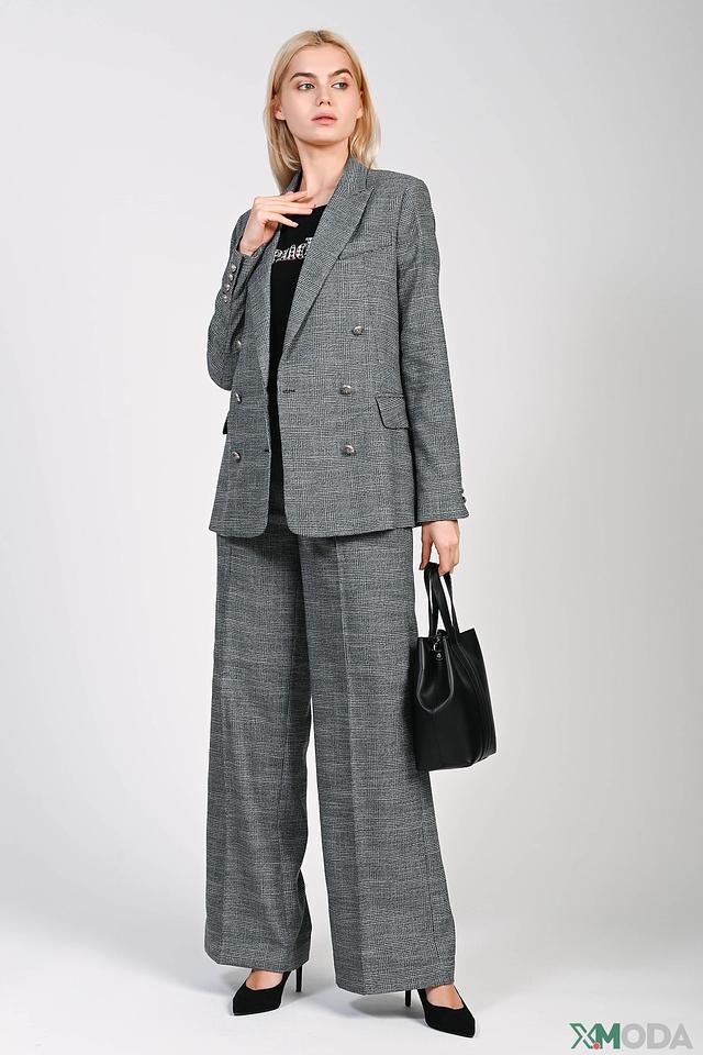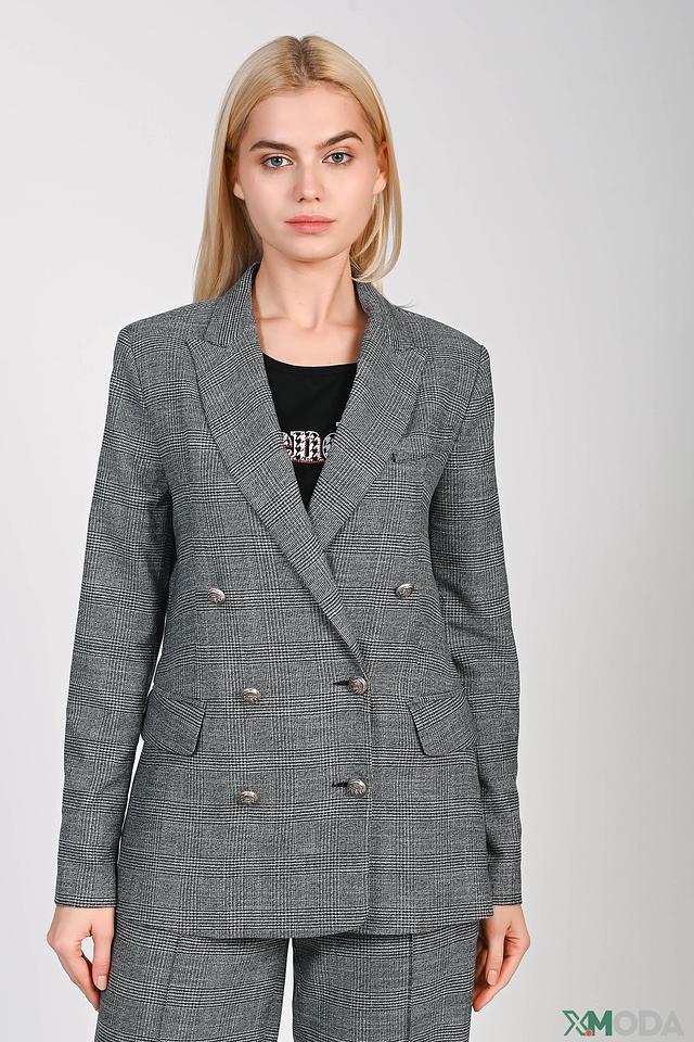 Жакет имеет двубортный крой с лацканами, что придает ему более строгий и формальный вид. Застежка на пуговицы обеспечивает надежную фиксацию. Длинные рукава с аккуратными манжетами дополняют образ.