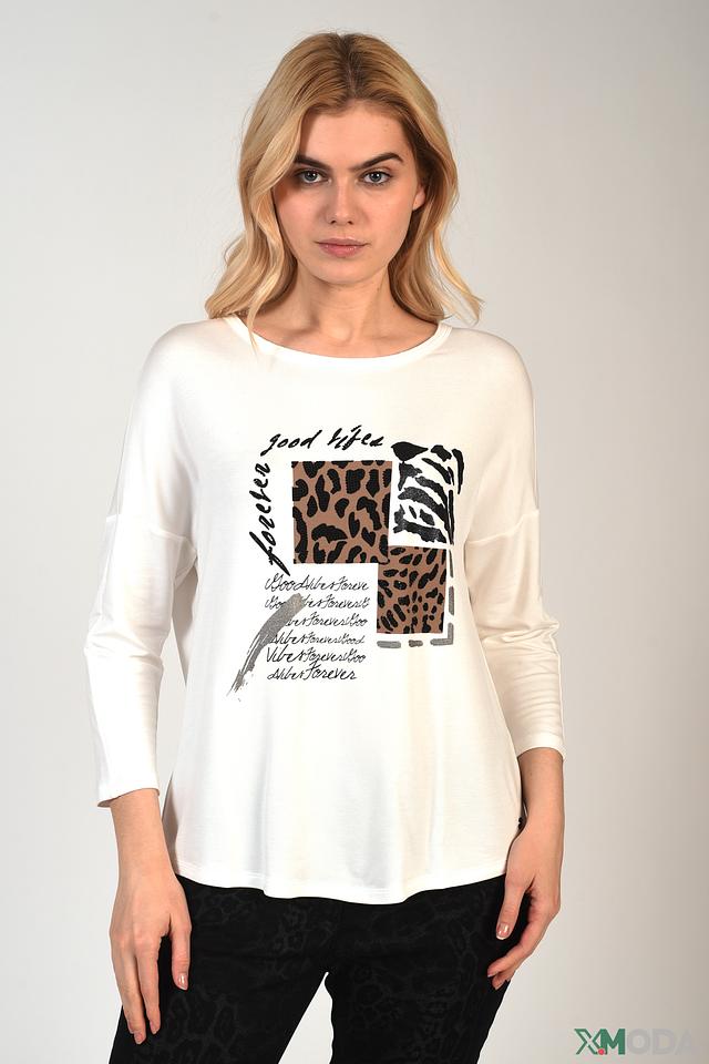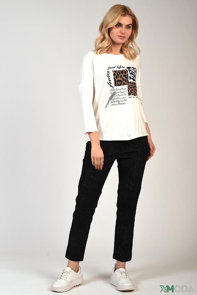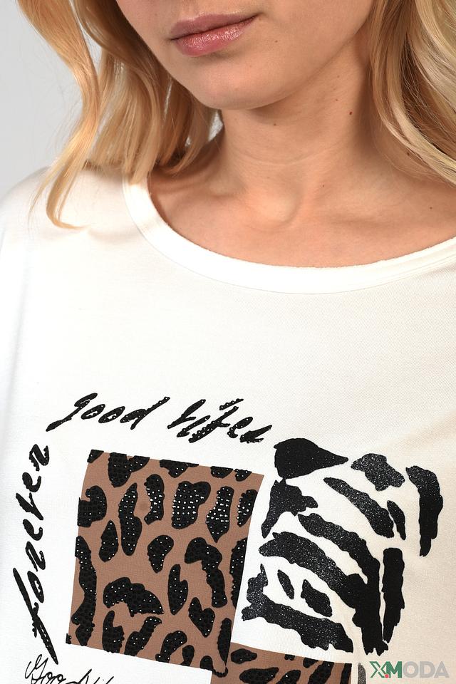Белая футболка Monari с оригинальным принтом в виде леопардовых и зебровых пятен. Модель выполнена из мягкой вискозы с добавлением модала и эластана, обеспечивающих комфорт и хорошую посадку. Состав: вискоза 45%, модал 45%, эластан 10%