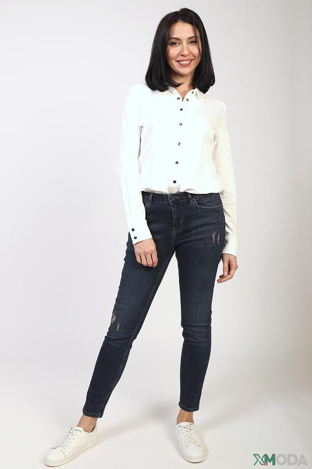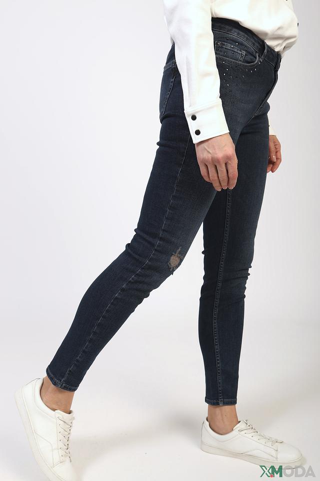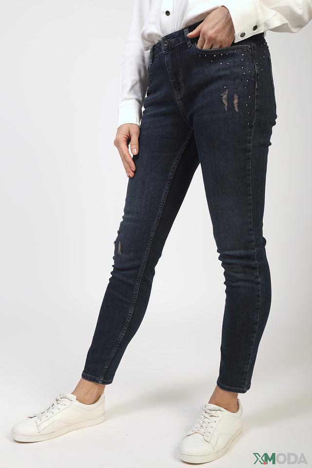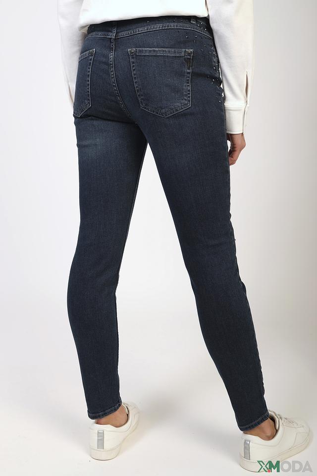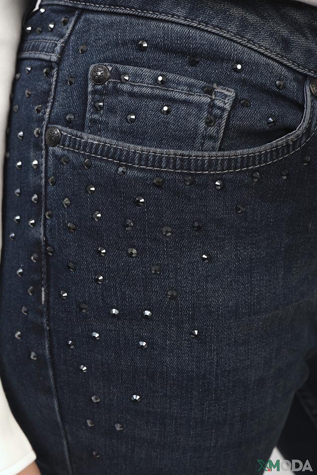 Джинсы Monari тёмно-синего цвета – это стильная модель с эффектным декором из страз на задних карманах и небольшими потертостями. Плотный хлопок с добавлением эластана обеспечивает комфорт и отличную посадку по фигуре. Состав: хлопок 98%, эластан 2%