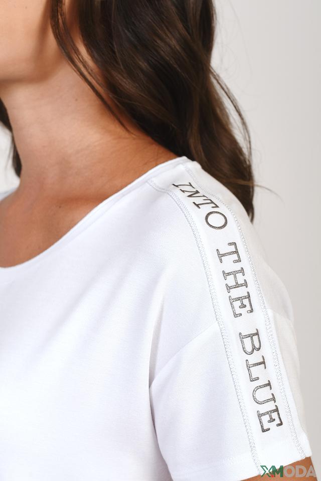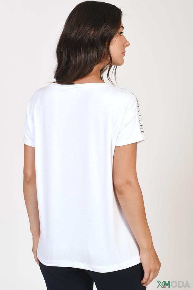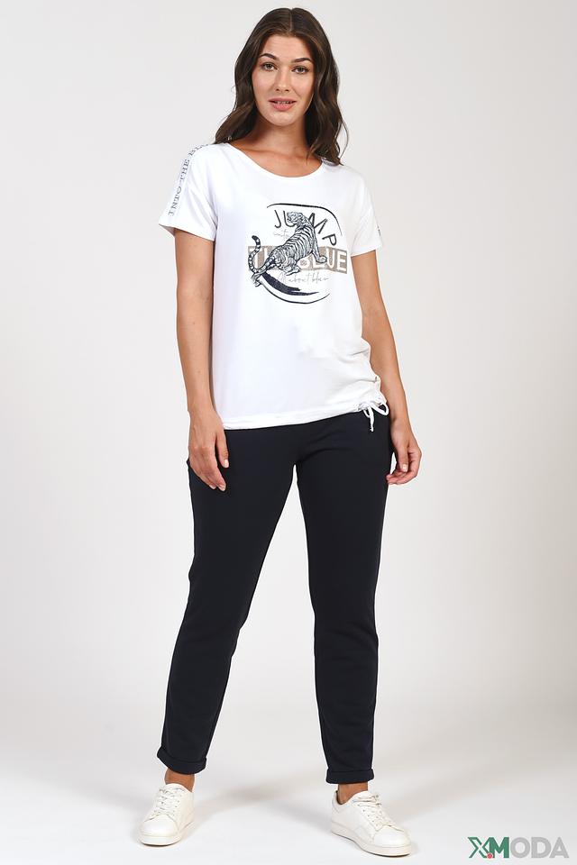 Белая футболка Monari с ярким принтом зебры и надписью. Модель из мягкого трикотажа с короткими рукавами и декоративной кулиской по низу. Идеальный выбор для создания стильного повседневного образа. Состав: вискоза 45%, модал 45%, эластан 10%