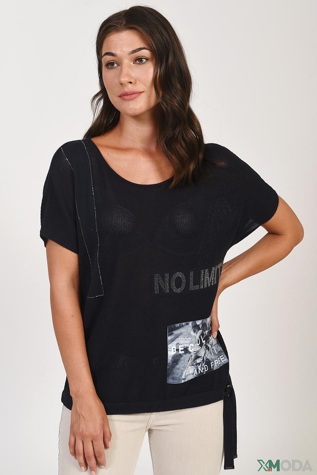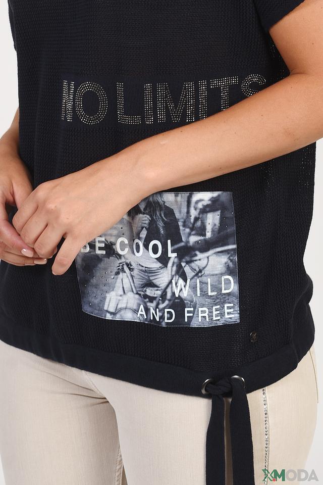 Чёрный пуловер Monari с короткими рукавами и ярким принтом "No Limits" станет стильным дополнением к вашему гардеробу. Изготовлен из 100% хлопка, обеспечивая комфорт и воздухопроницаемость. Модель дополнена кулиской. Состав: хлопок 100%