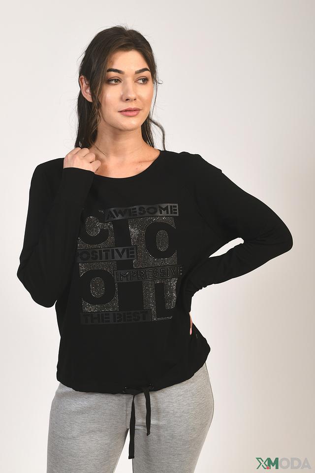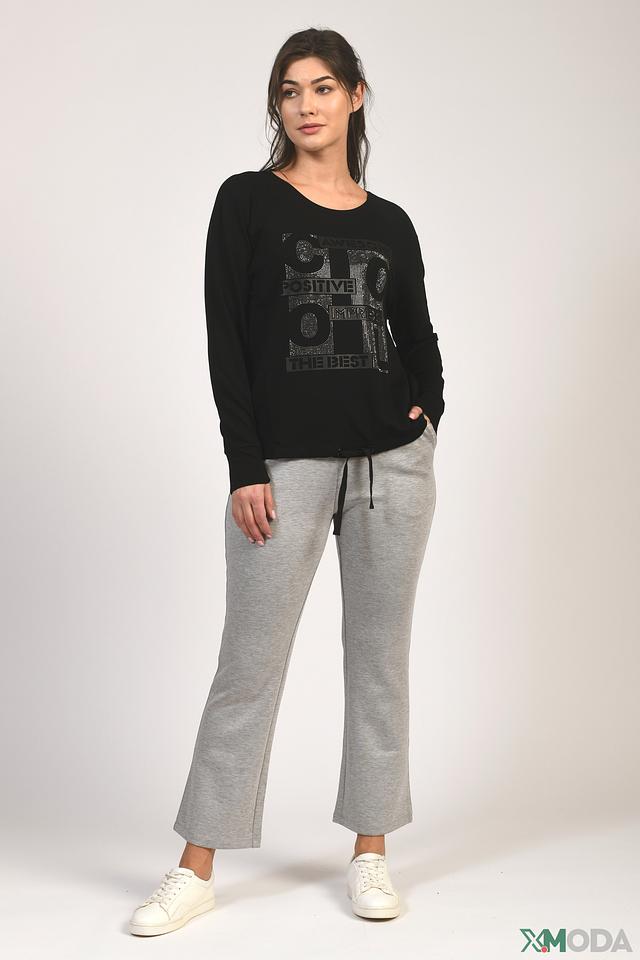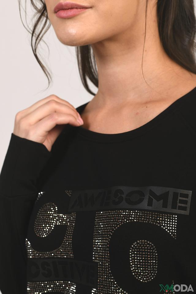Особенностью данной модели является яркий декор из страз, расположенный на передней части изделия. Этот акцент придает джемперу оригинальность и привлекает внимание. Джемпер имеет удобный крой и выполнен из высококачественного трикотажа, в составе которого вискоза, модал и эластан.