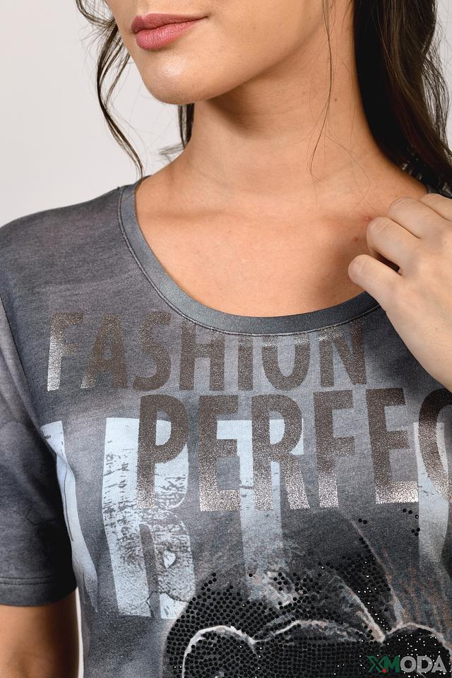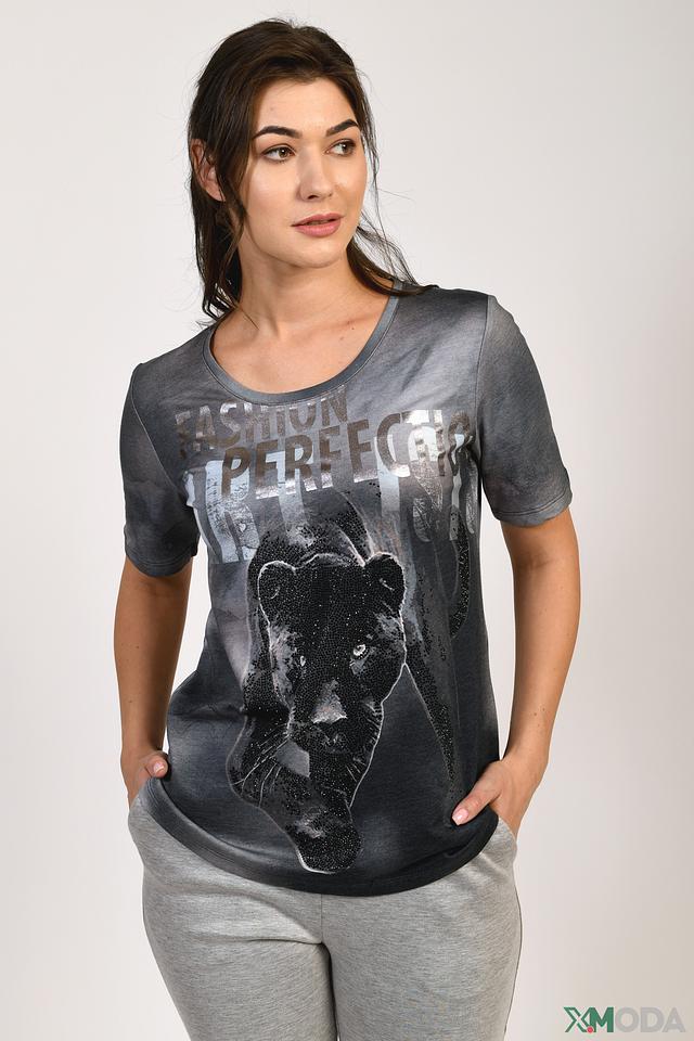 Женская футболка Monari серого цвета с эффектным принтом пантеры. Изготовлена из мягкого хлопка с модалом, обеспечивающего комфорт и приятные ощущения при носке. Стильный и современный выбор для повседневного образа. Состав: хлопок 50%, модал 50%