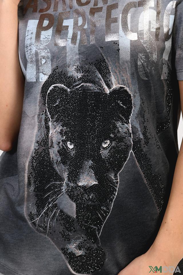 Основной цвет футболки – серый меланж, который отлично сочетается с различными оттенками. Главная особенность модели – крупный принт в виде изображения пантеры, выполненный в технике имитации графики и с добавлением блестящих элементов.