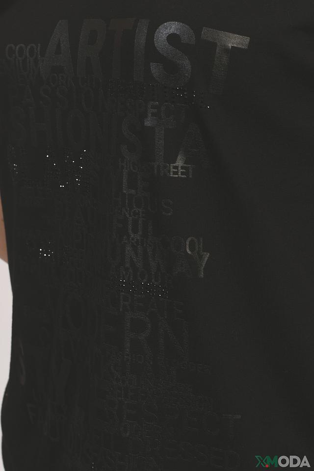 Особенностью данной модели является эффектный принт "ARTIST", выполненный в технике тиснения и декорированный небольшими стразами, что придает футболке изысканность и индивидуальность.