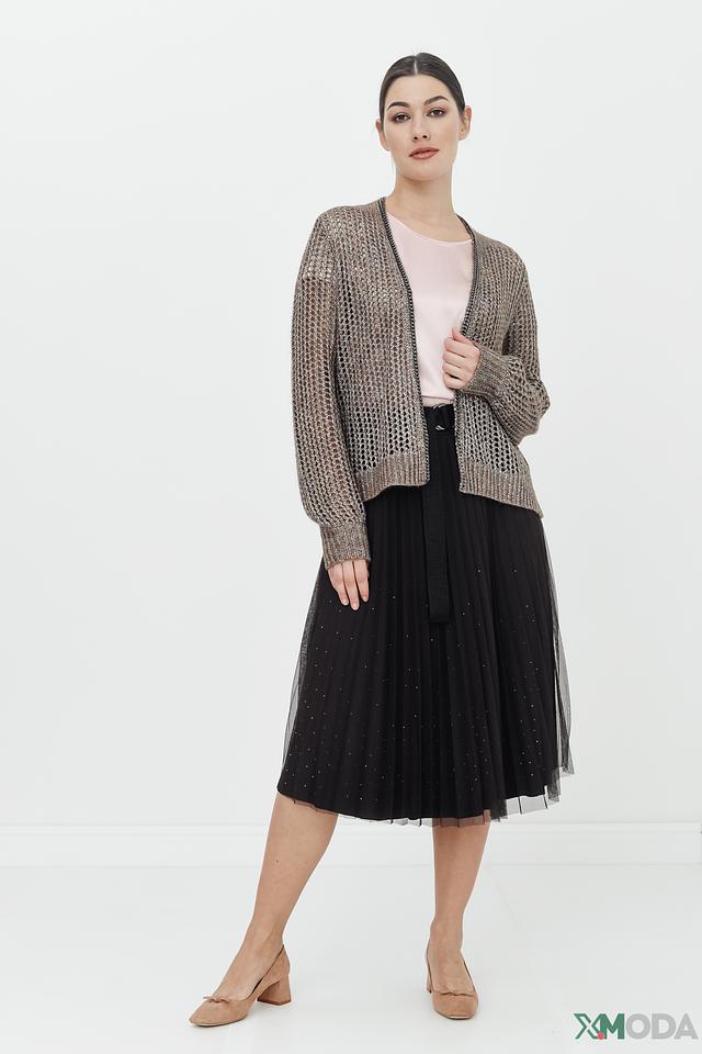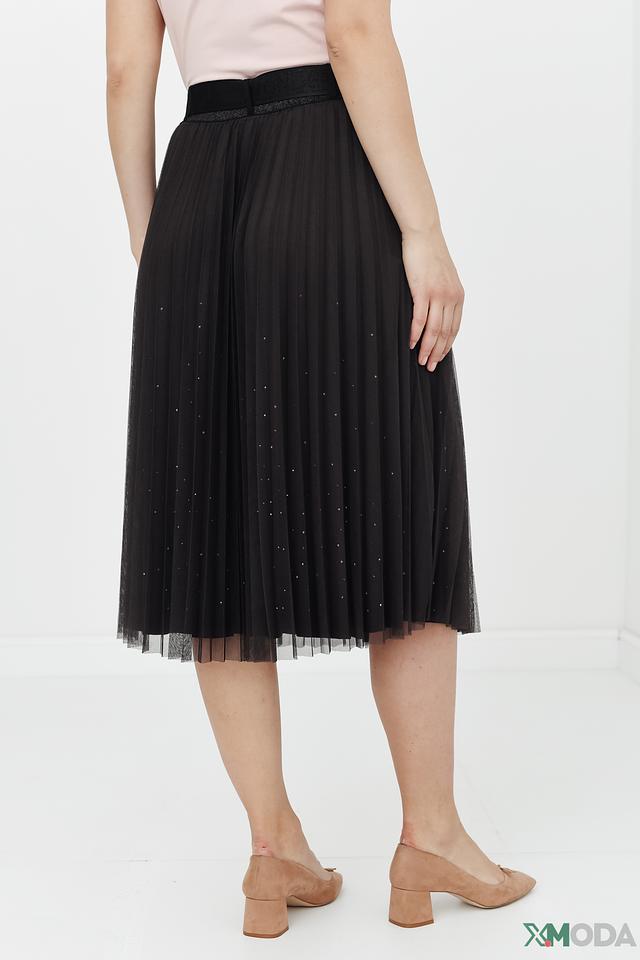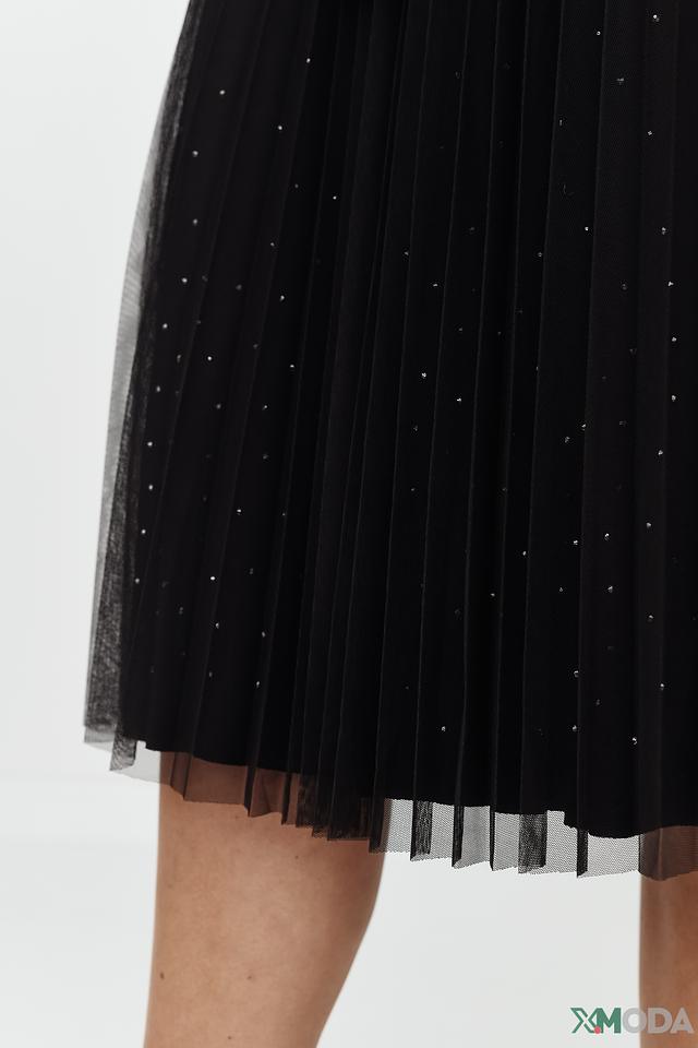 Юбка имеет плиссированную фактуру, которая придает ей лёгкость и воздушность. Подкладка из вискозы с добавлением эластана обеспечивает комфорт при носке. Модель украшена деликатной вышивкой из мелких страз, которые придают ей праздничный вид.