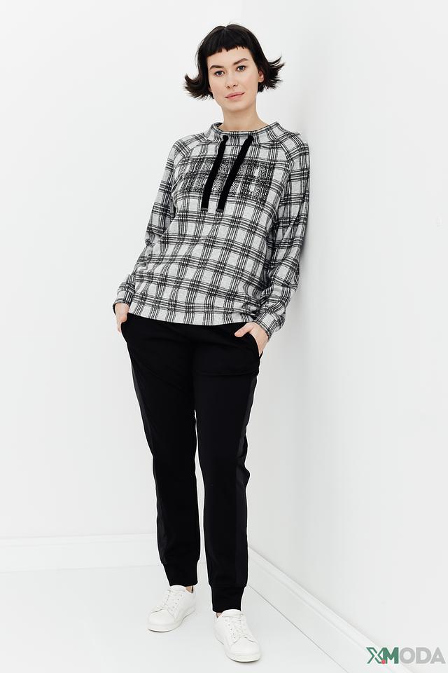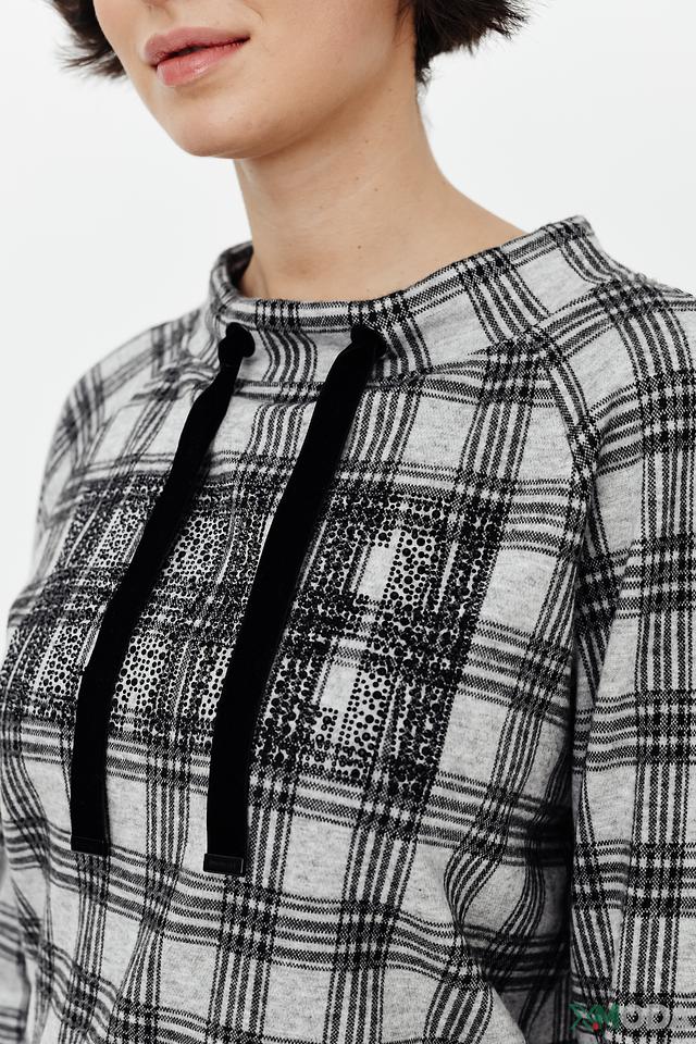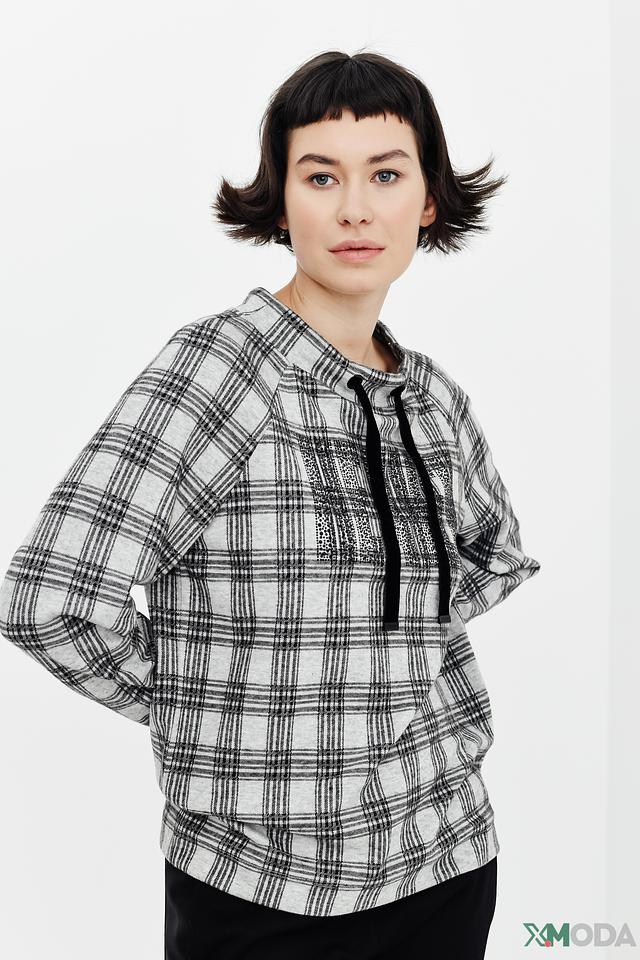 Стильный пуловер Monari серого цвета с клетчатым принтом и декоративными шнурками на горловине. Модель выполнена из мягкого и приятного к телу сочетания полиэстера, вискозы и эластана, обеспечивающего комфорт и свободу движений. Состав: полиэстер 68%, вискоза 29%, эластан 3%