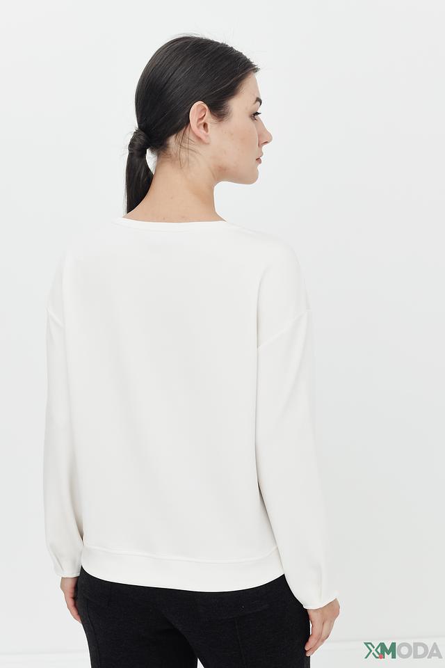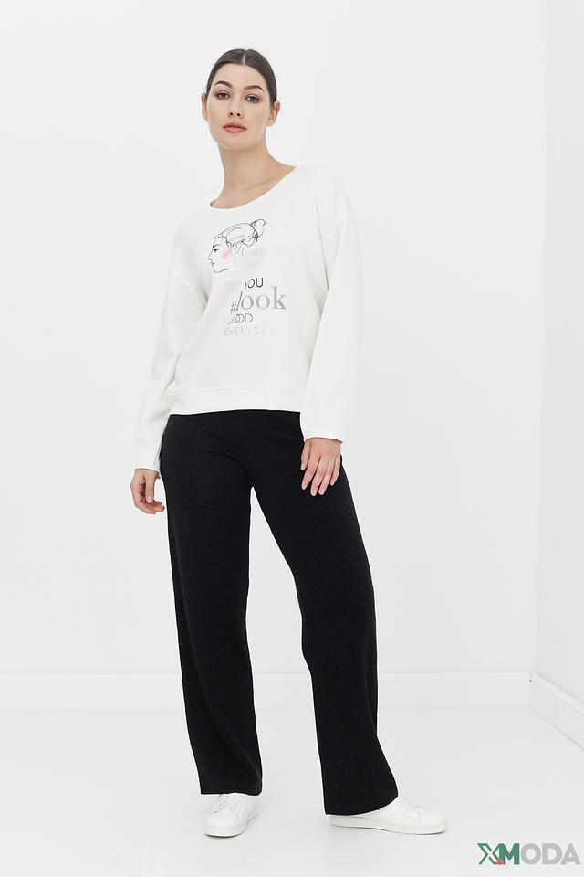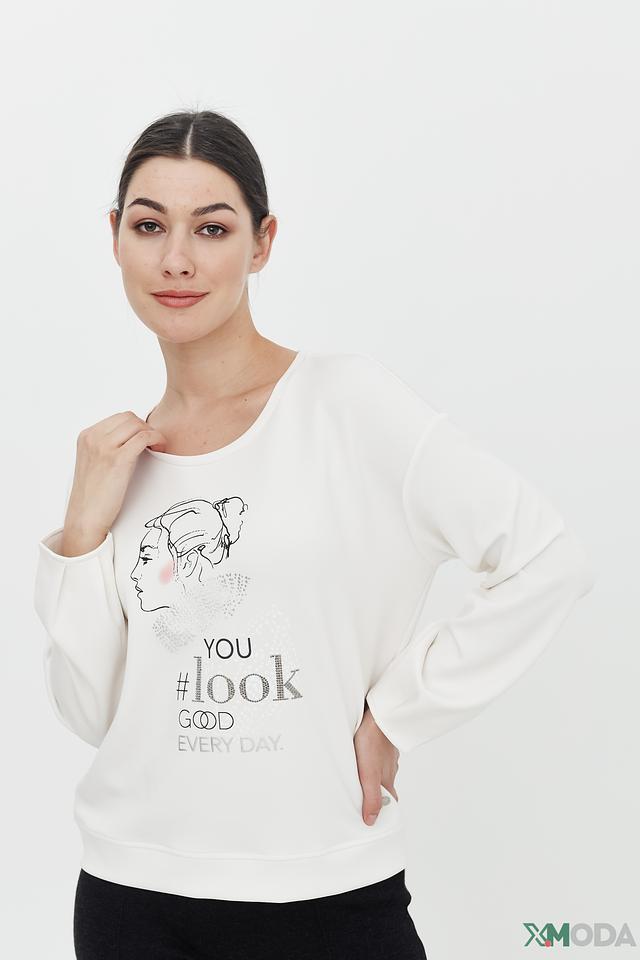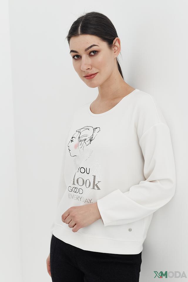 Белый пуловер Monari с оригинальным принтом в виде лица и надписью "You look good everyday". Изготовлен из мягкого и приятного к телу сочетания полиэстера и модала, обеспечивающего комфорт в носке. Идеальный выбор для создания стильного и непринужденного образа. Состав: полиэстер 52%, модал 42%, эластан 6%