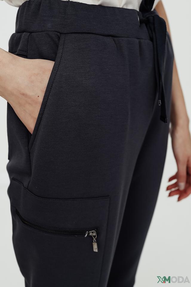 Брюки имеют эластичный пояс с кулиской, что обеспечивает комфортную посадку по фигуре. Боковой карман на молнии добавляет функциональности и стиля. Материал брюк – сочетание полиэстера, вискозы и эластана, что делает их приятными на ощупь и устойчивыми к сминанию.