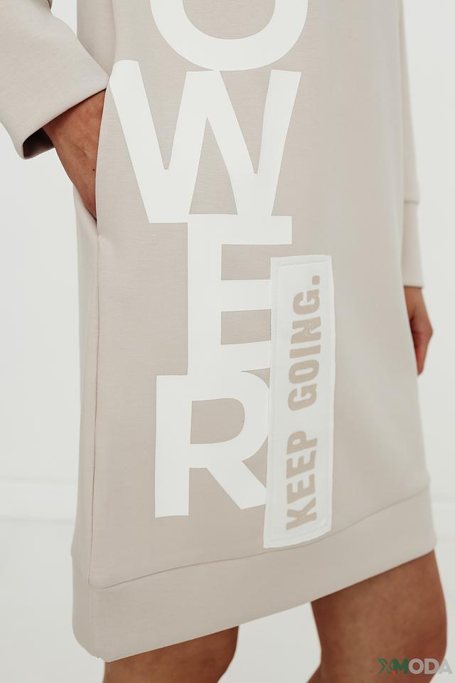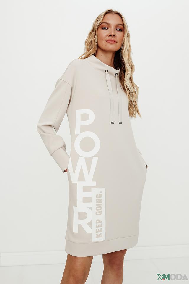 Бежевое платье от Monari – это стильное и комфортное решение для повседневного образа. Модель выполнена из мягкого трикотажа с актуальной надписью и удобным капюшоном. Состав: полиэстер 78%, вискоза 18%, эластан 4%
