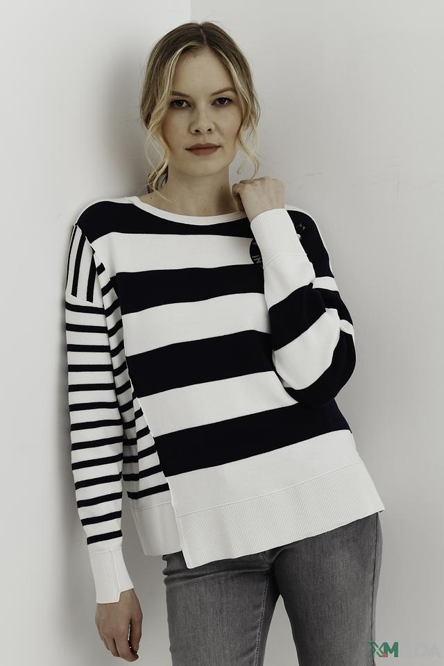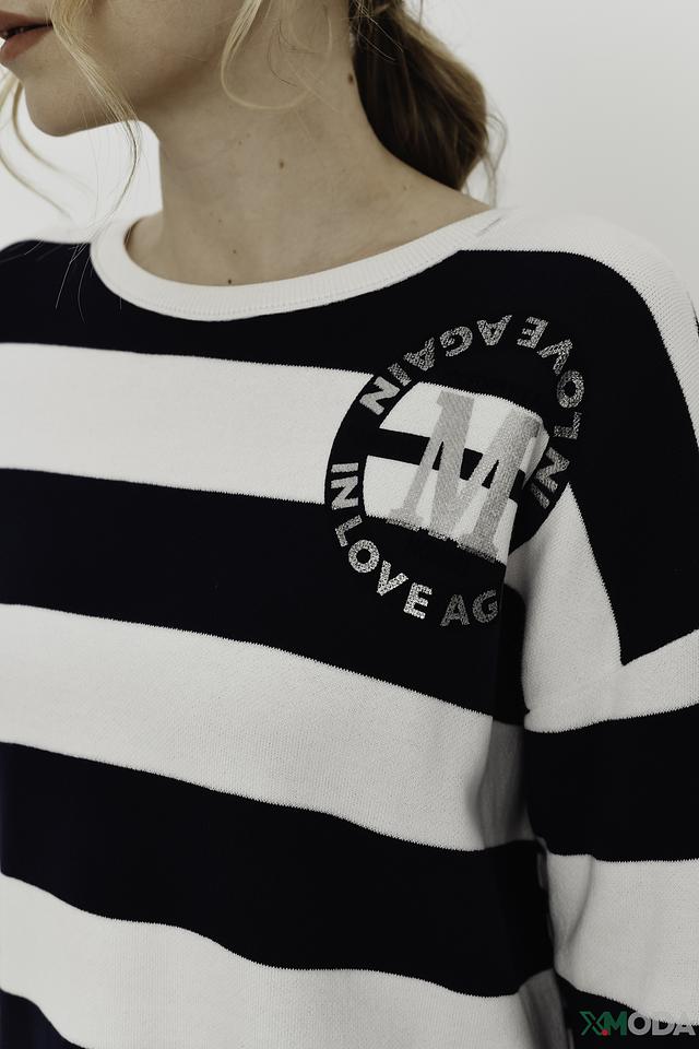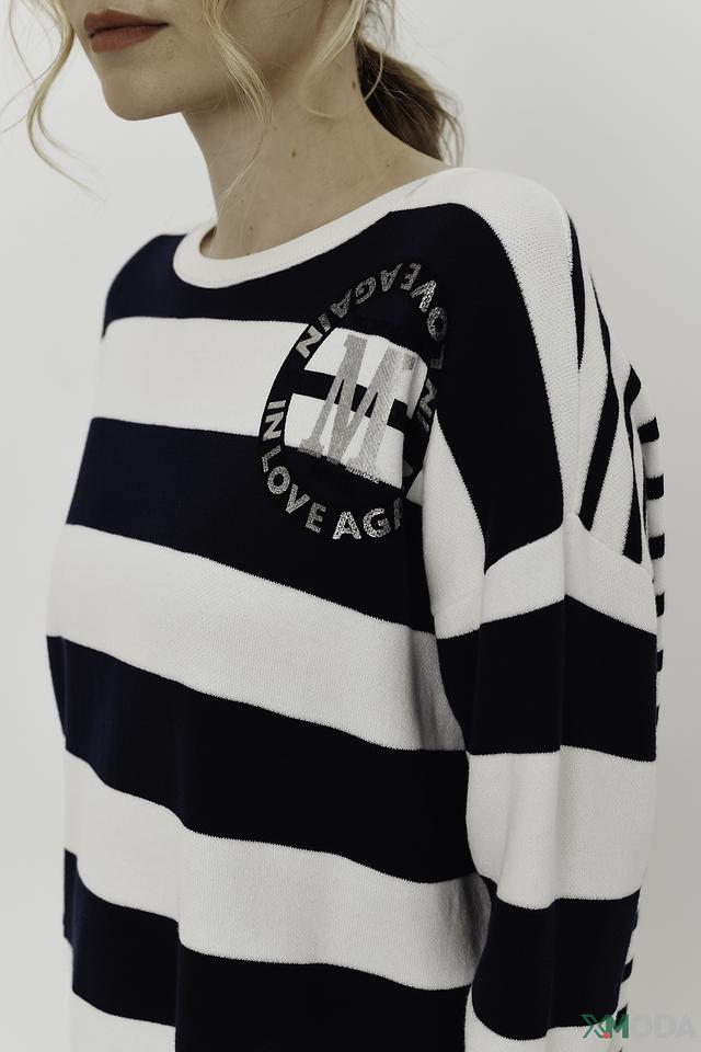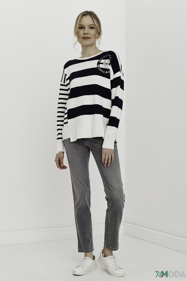 Женский пуловер Monari белого и тёмно-синего цвета, выполнен в полоску с круглым вырезом и оригинальным принтом. Модель из 100% хлопка обеспечит комфорт и удобство в повседневной носке. Состав: хлопок 100%