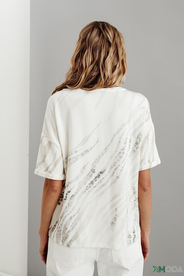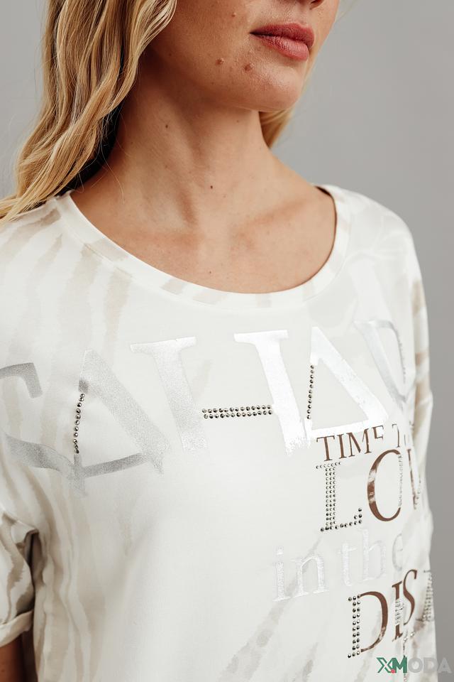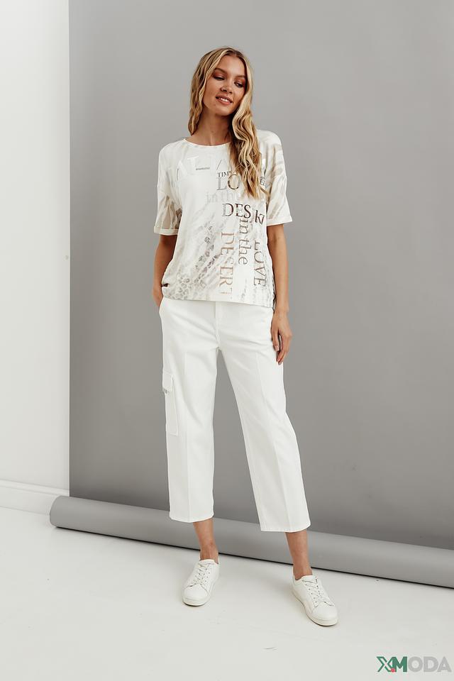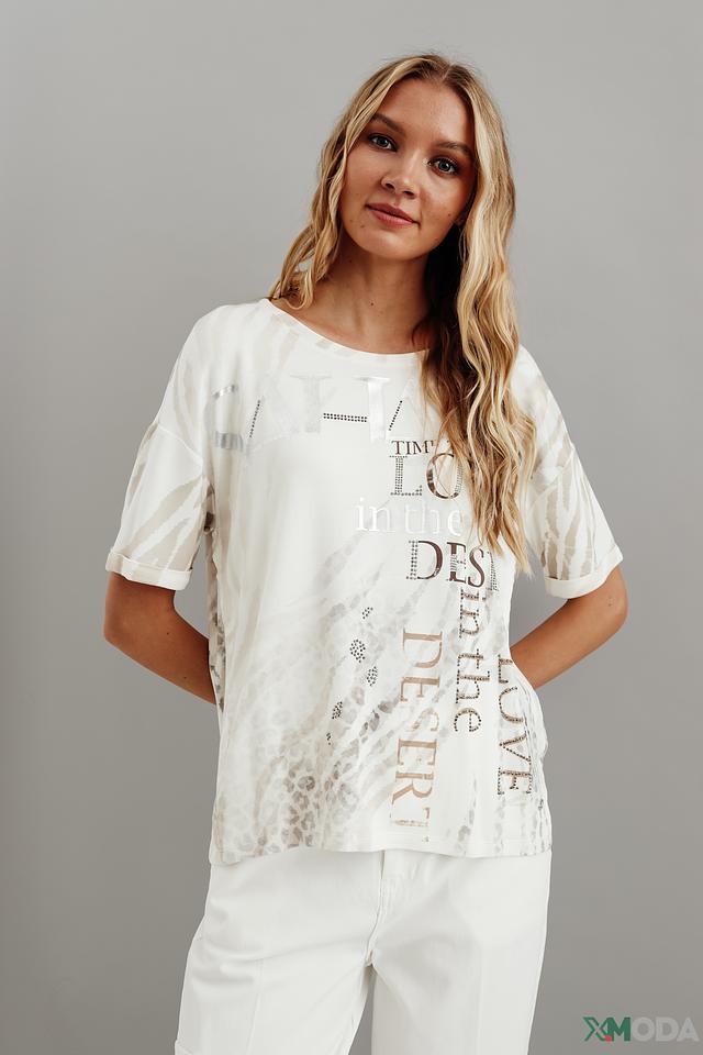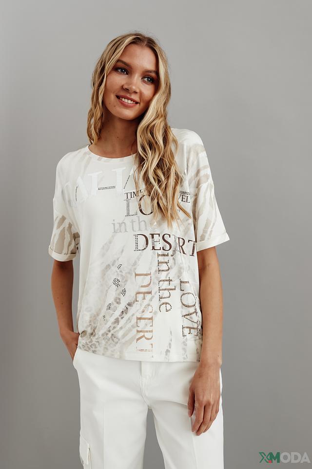 Белая футболка Monari с оригинальным принтом и короткими рукавами станет стильным дополнением к вашему гардеробу. Изготовлена из мягкой и приятной к телу ткани, обеспечивающей комфорт в течение дня. Состав: вискоза 45%, модал 45%, эластан 10%