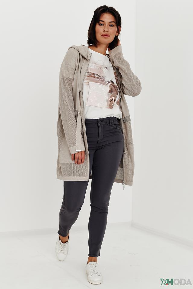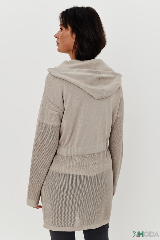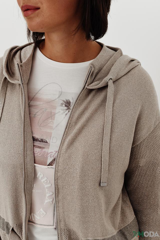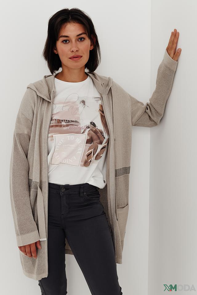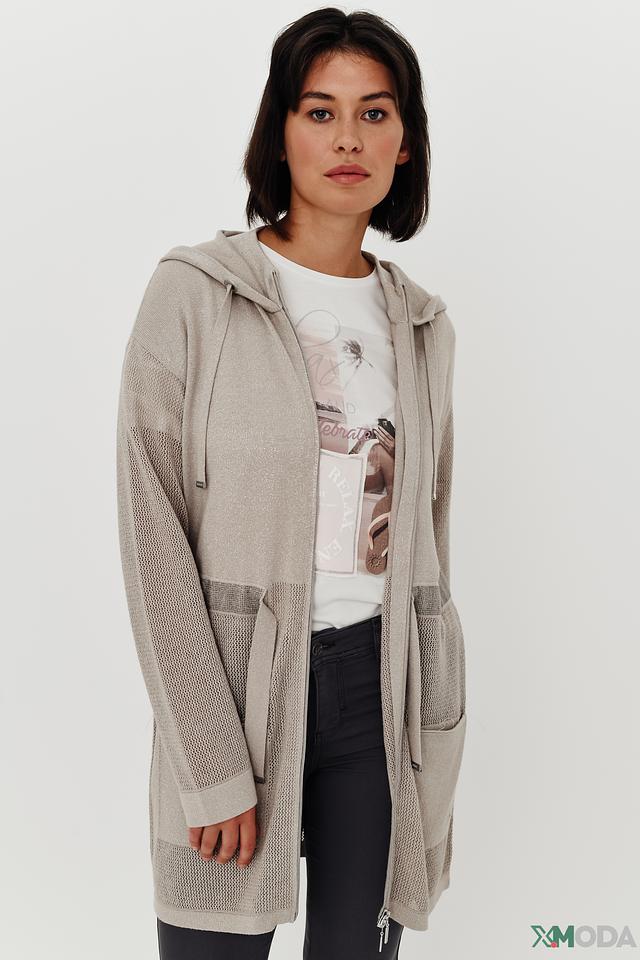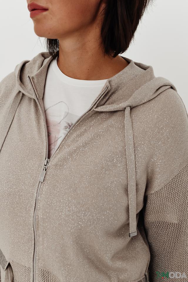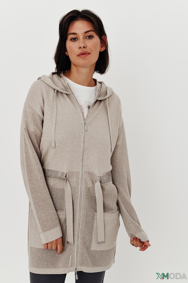Бежевый жакет Monari с капюшоном и завязками – это стильное и комфортное решение для создания модных образов. Модель выполнена из мягкого трикотажа с добавлением металлизированной нити, что придает ей особый шарм. Состав: хлопок 81%, метализ.полиэстер 19%