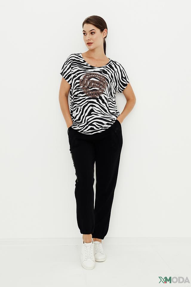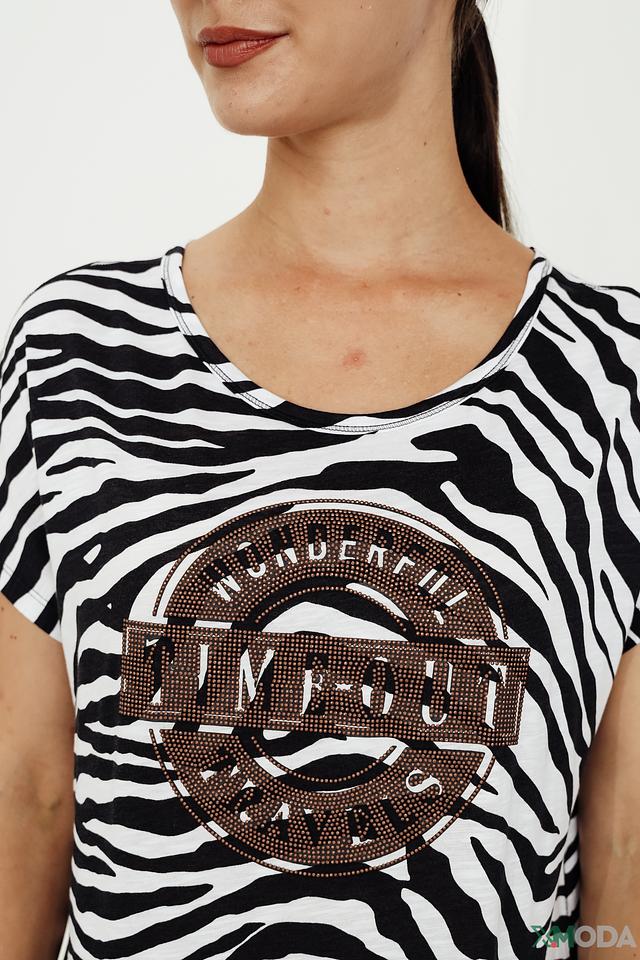 Основной акцент в дизайне блузы – эффектный принт в виде зебры, выполненный в контрастных чёрных и белых тонах. Передняя часть блузы украшена крупным декоративным элементом с надписями и графическими элементами, добавляющим образу оригинальности.