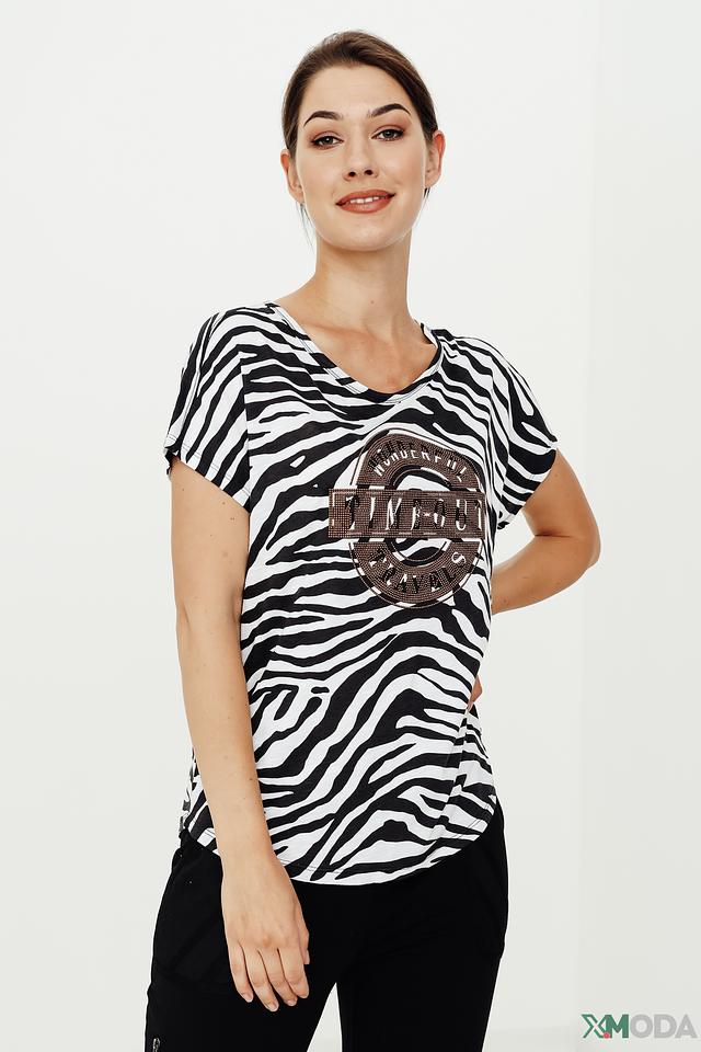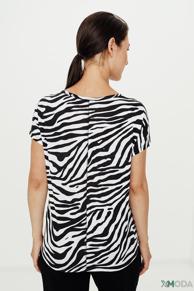 Блуза Monari чёрно-белого цвета с ярким принтом "зебра" станет стильным дополнением к вашему гардеробу. Модель выполнена из мягкой и приятной к телу ткани, имеет короткий рукав и округлый вырез горловины, украшенный декоративным элементом. Состав: хлопок 50%, модал 50%
