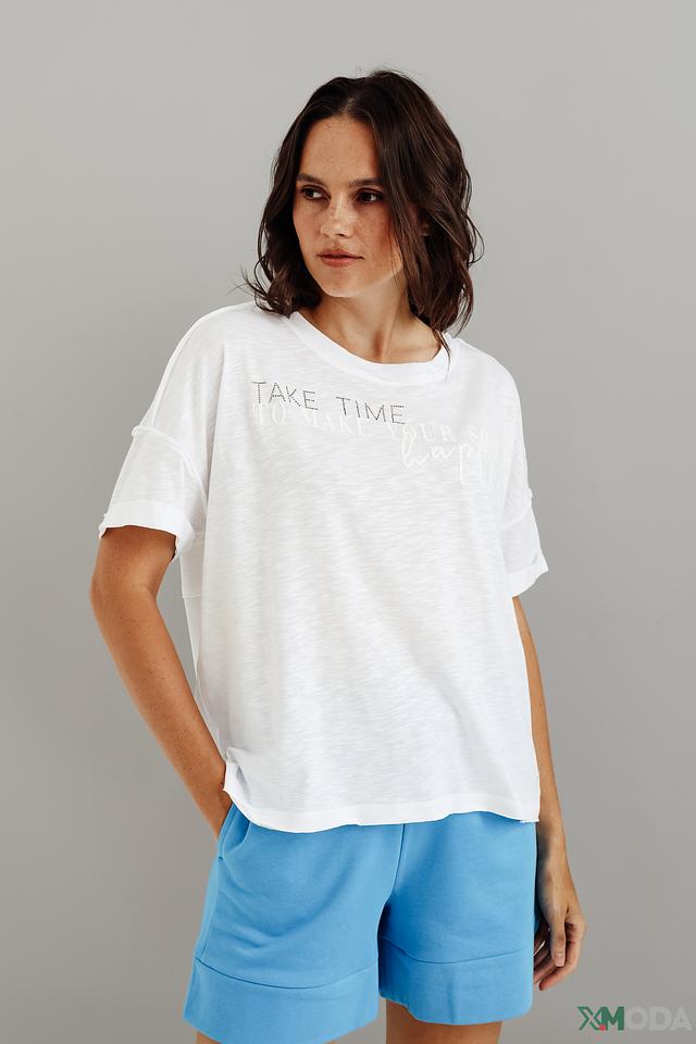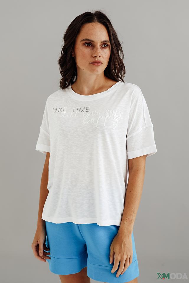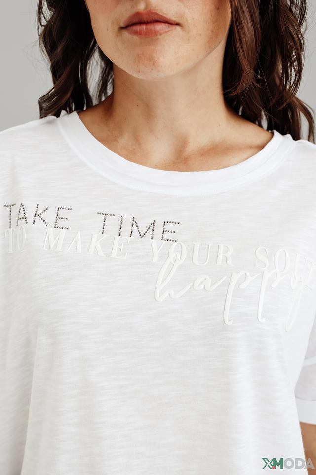 Белая футболка Monari с оригинальным принтом "TAKE TIME". Модель свободного кроя из мягкого хлопка с модалом обеспечит комфорт в течение дня. Идеальный выбор для создания повседневных образов. Состав: хлопок 50%, модал 50%