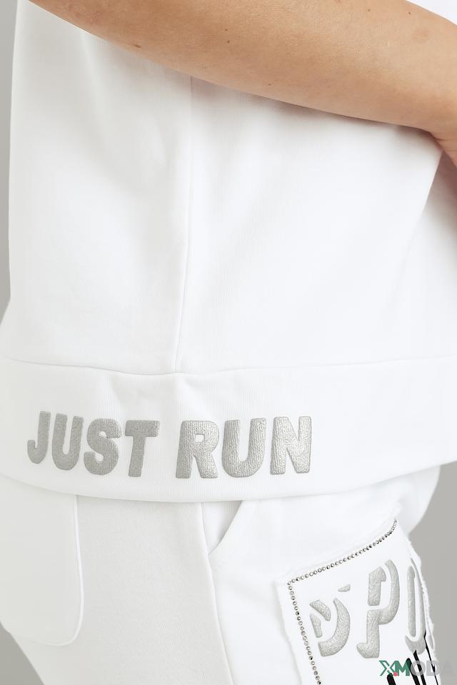 Эта стильная футболка от Monari выполнена в белом цвете и украшена эффектным синим принтом с надписью "Original Just Run". Модель имеет свободный крой, который обеспечивает комфорт и свободу движений.