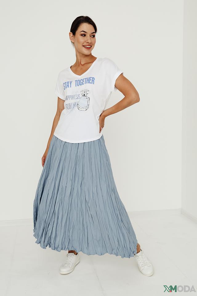 Особенностью данной модели является яркий принт с изображением флакона духов и надписями "Stay Together", "Happiness", "Summer". Принт выполнен в светло-голубых тонах, что добавляет футболке свежести и легкости.
