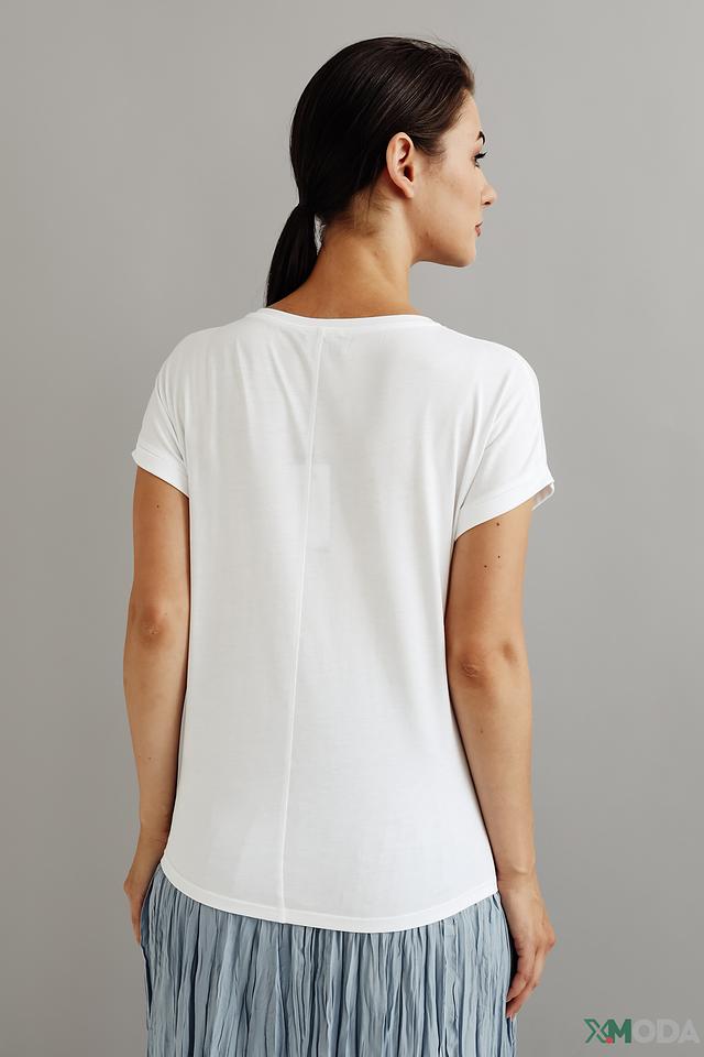 Футболка имеет прямой крой, короткие рукава и V-образный вырез горловины. Она идеально сочетается с юбками, брюками и джинсами, позволяя создавать разнообразные образы. Состав ткани: 50% хлопок, 50% модал.