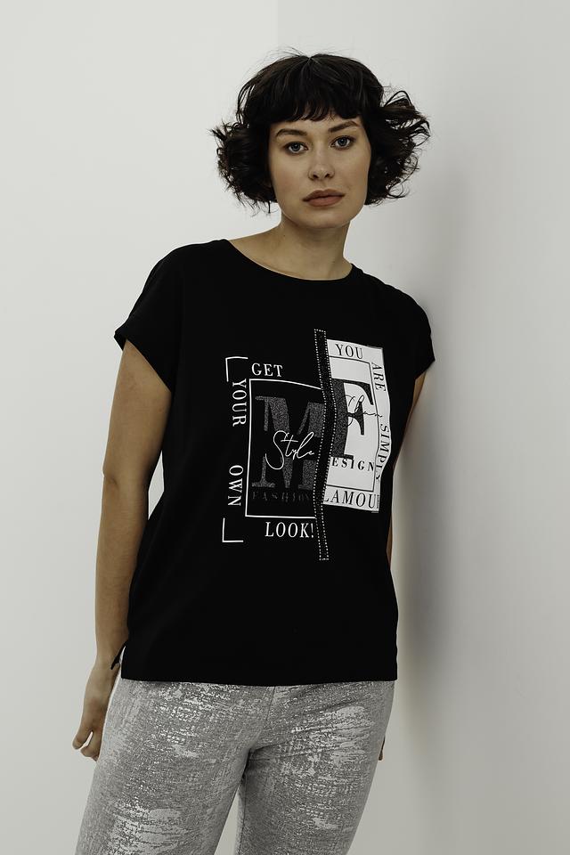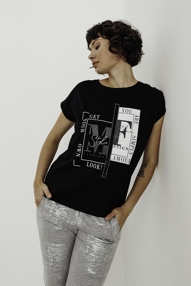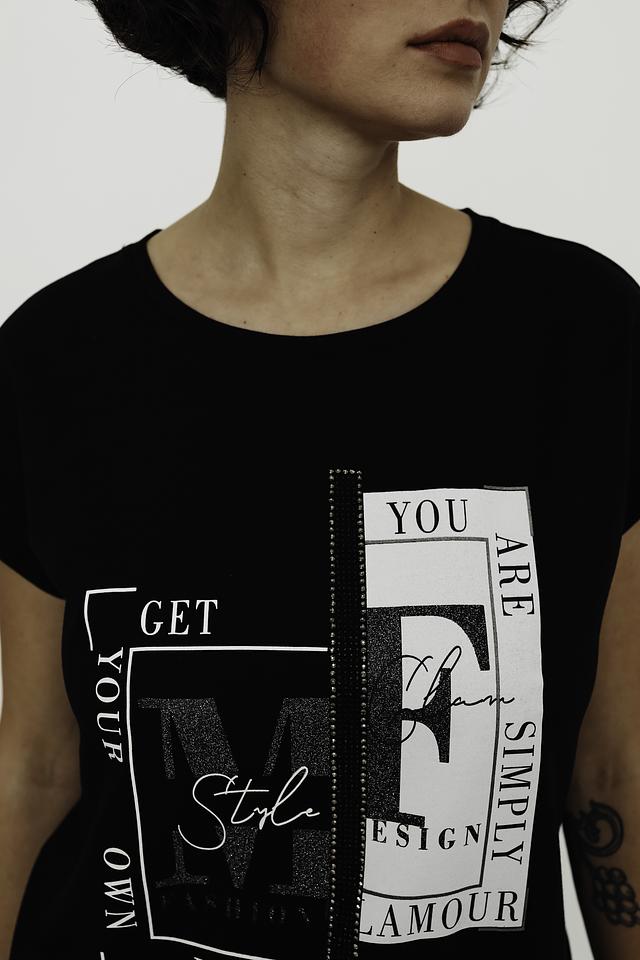 Эта футболка от Monari станет отличным дополнением к вашему гардеробу. Выполнена в классическом чёрном цвете, украшена эффектным принтом с надписями и графическими элементами.