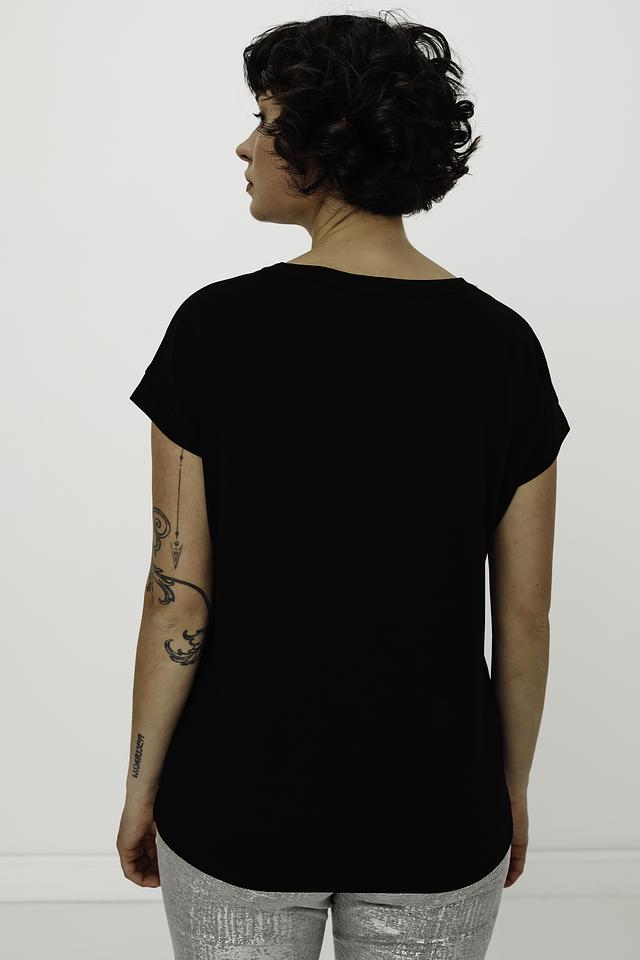 Футболка прекрасно сочетается с джинсами, брюками, шортами или юбками. Её можно носить как самостоятельный элемент образа, так и под жакет или кардиган. Это универсальная вещь, которая позволит вам создавать разнообразные стильные образы.