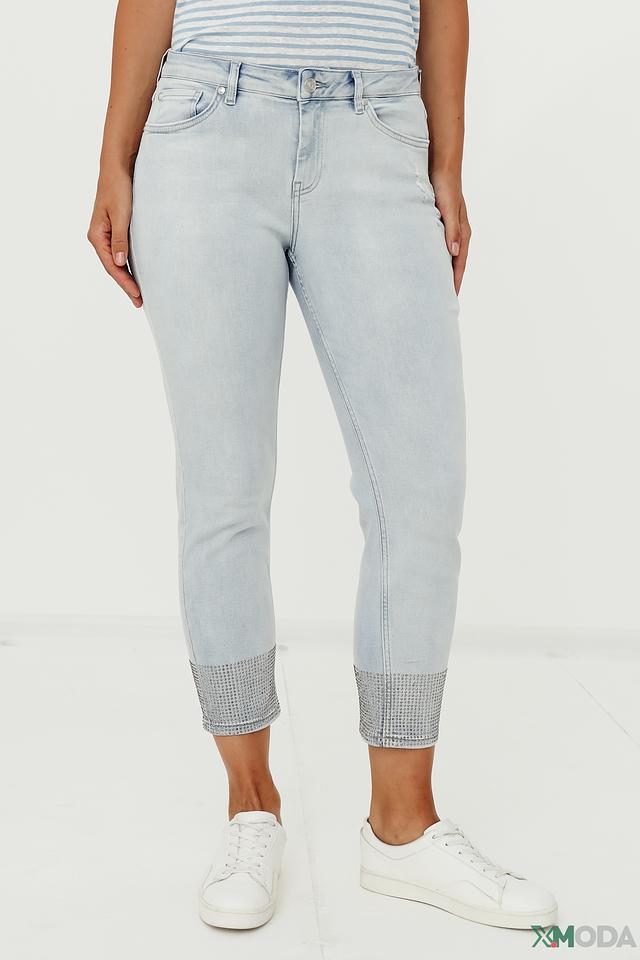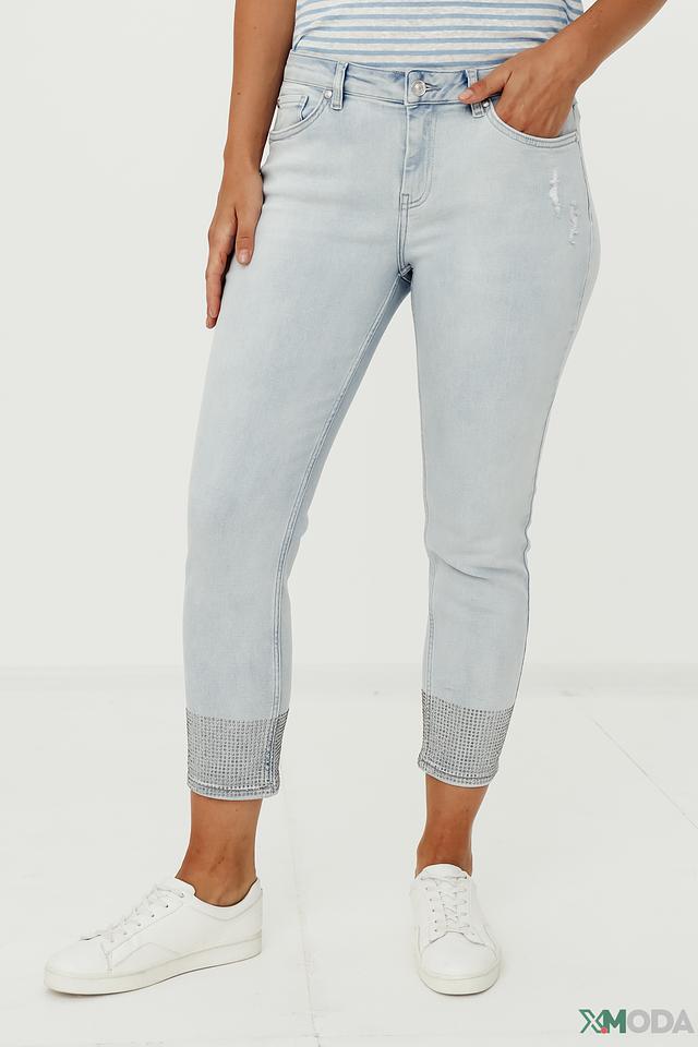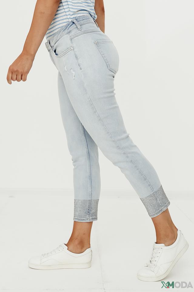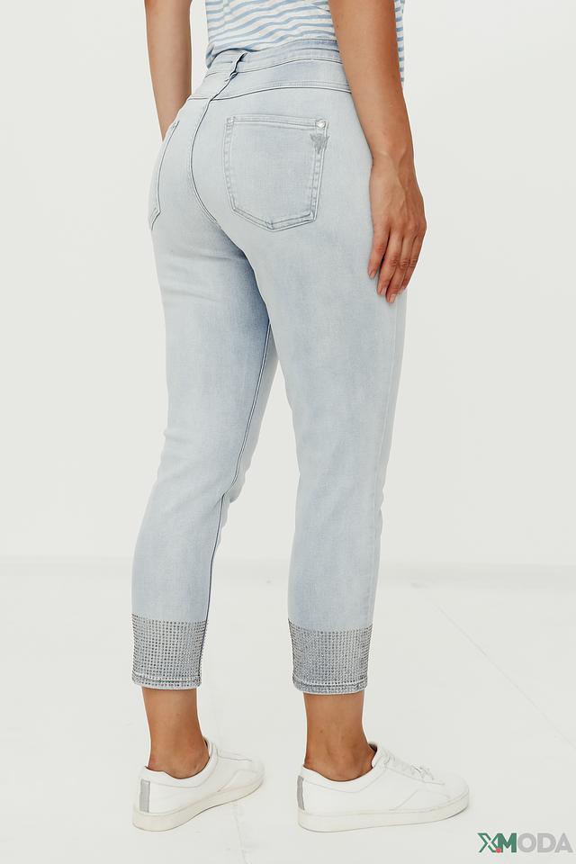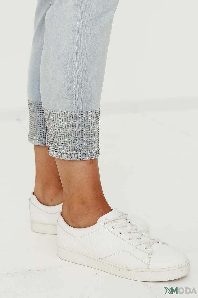 Джинсы имеют укороченный крой, который подчеркивает щиколотку, и зауженный силуэт, который визуально стройнит фигуру. Декоративная отделка на щиколотке, выполненная в виде страз, придает джинсам особый шарм и изысканность.