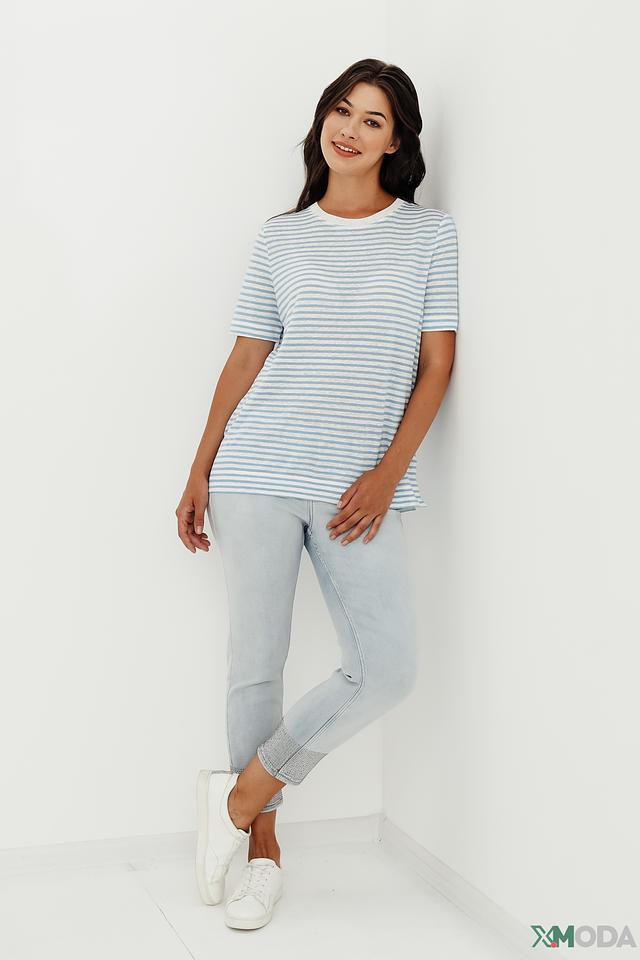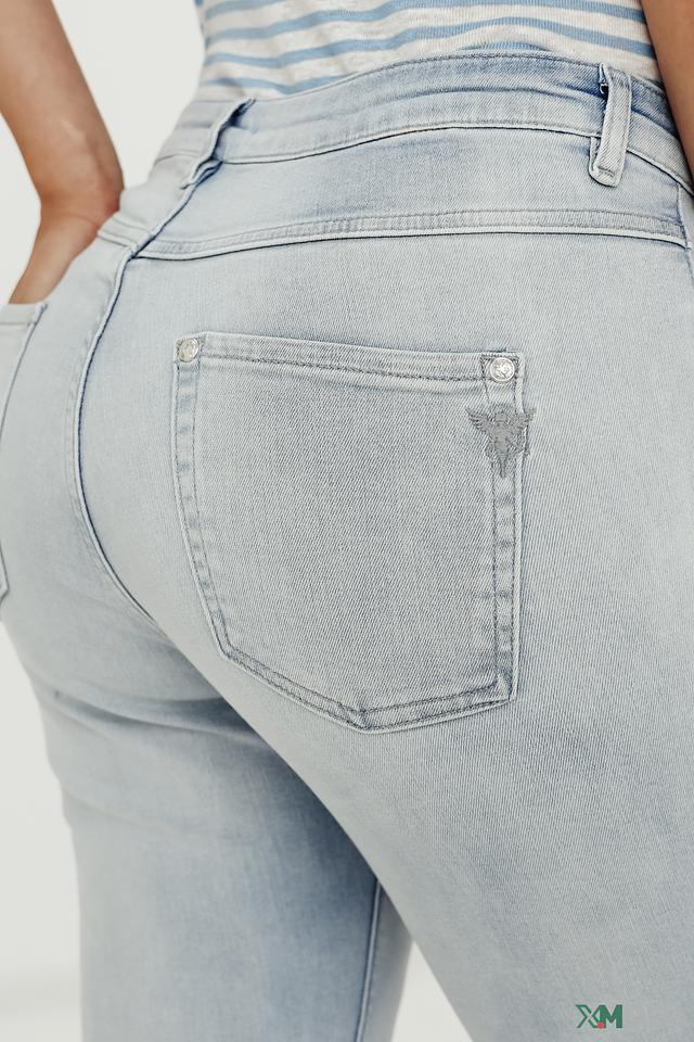 Светло-голубые джинсы Monari с укороченным силуэтом и декоративной отделкой на щиколотке. Модель выполнена из мягкого хлопка с добавлением эластана для комфортной посадки и свободы движений. Состав: хлопок 98%, эластан 2%