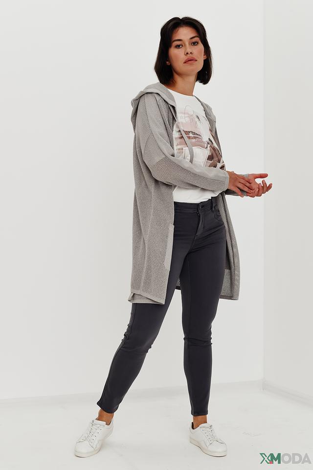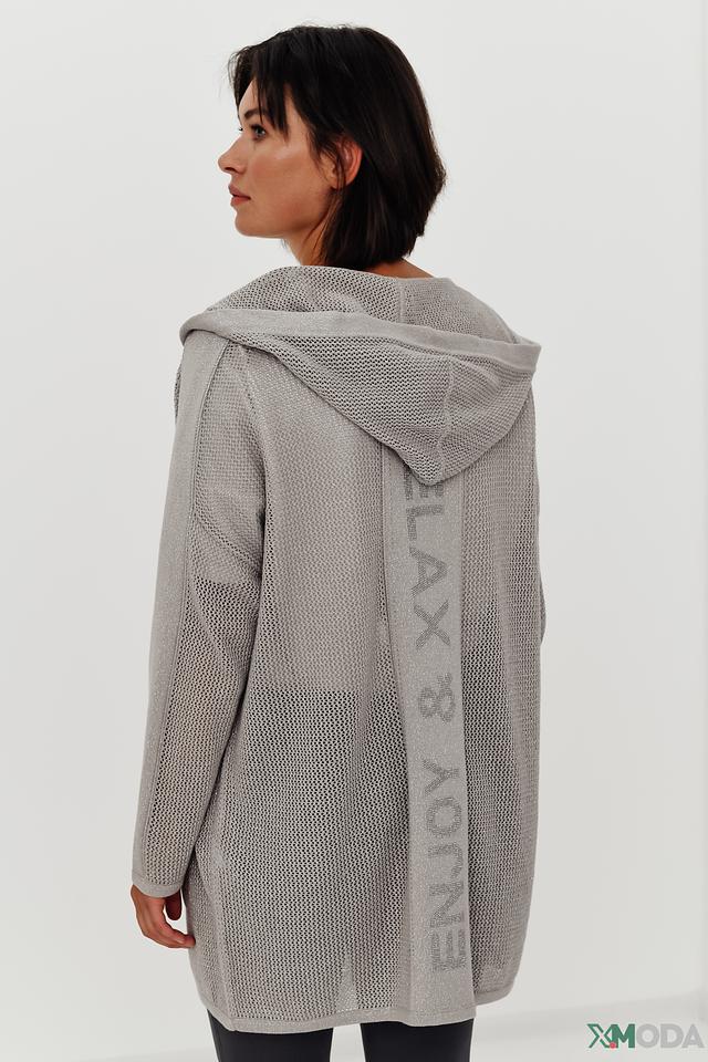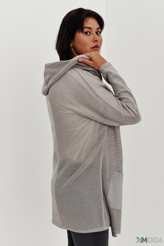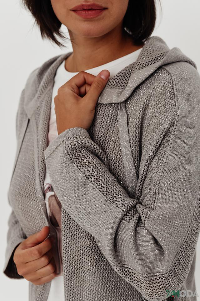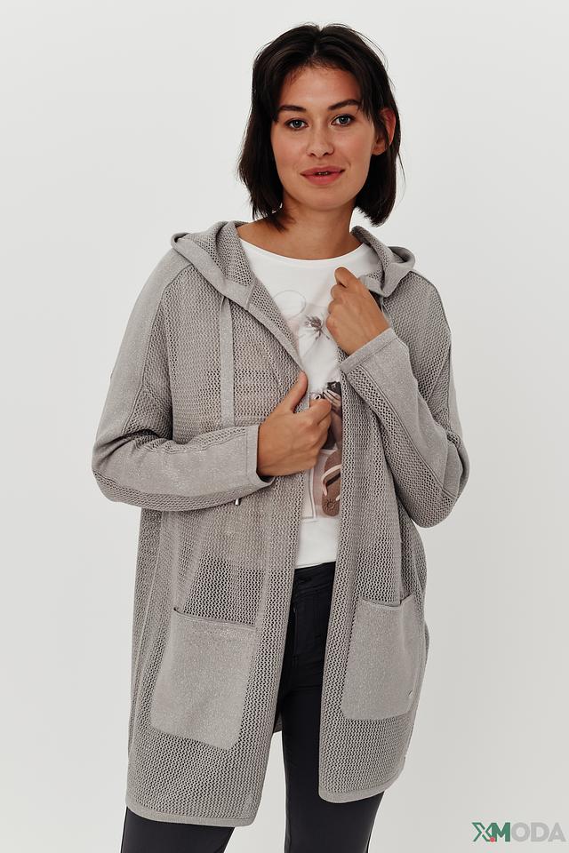 Серый жакет Monari с капюшоном и ажурной текстурой станет стильным дополнением к вашему гардеробу. Модель свободного кроя с карманами и надписью на спине подчеркнет вашу индивидуальность. Состав: хлопок 86%, метализ.нить 14%