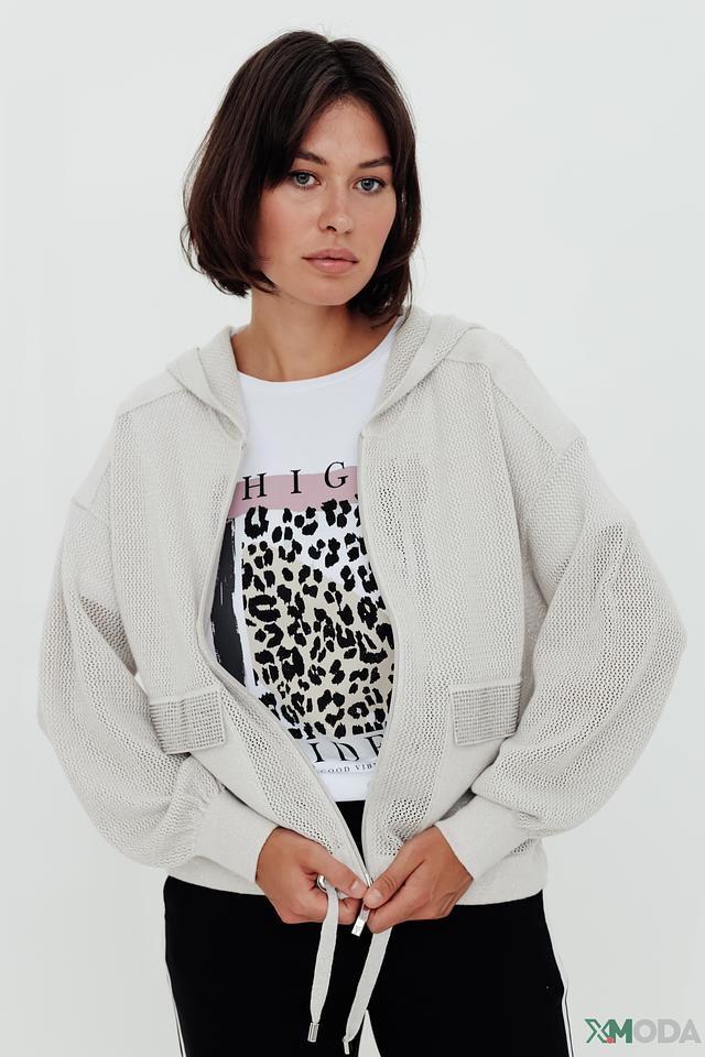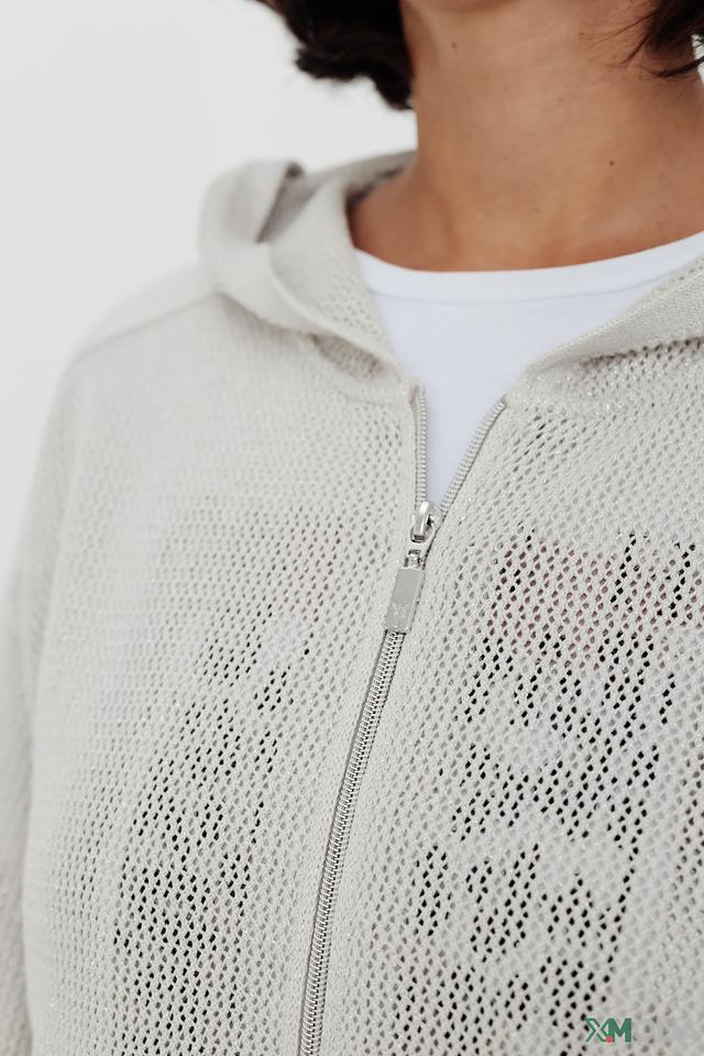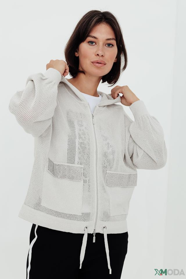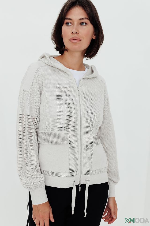 Бежевый жакет Monari с сетчатыми вставками и застежкой-молнией станет стильным дополнением к вашему гардеробу. Модель с капюшоном и рукавами-фонариками выполнена из хлопка с добавлением металлизированной нити. Состав: хлопок 85%, метализ.нить 15%