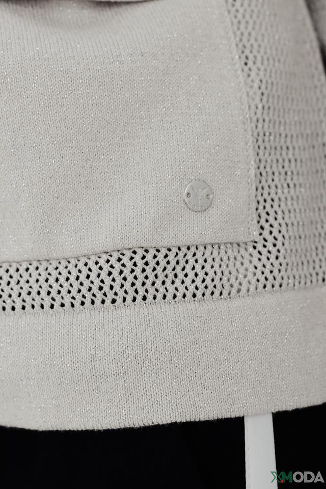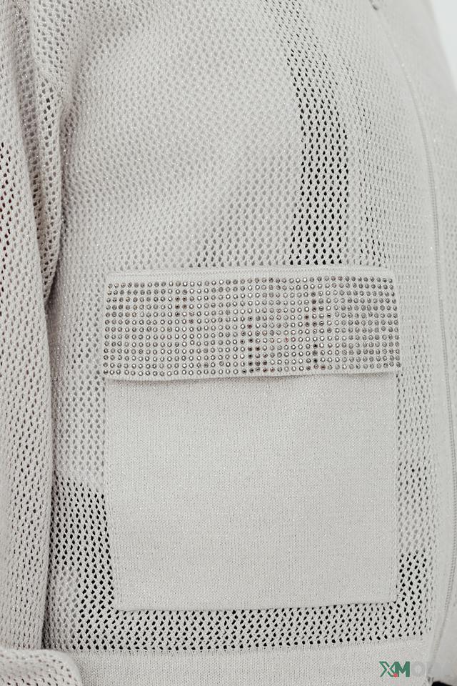 Особенностью модели являются сетчатые вставки, которые придают ей современный и оригинальный вид. Рукава-фонарики добавляют образу женственности и легкости. Жакет выполнен из высококачественного хлопка с добавлением металлизированной нити, что обеспечивает комфорт и долговечность.