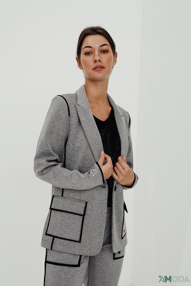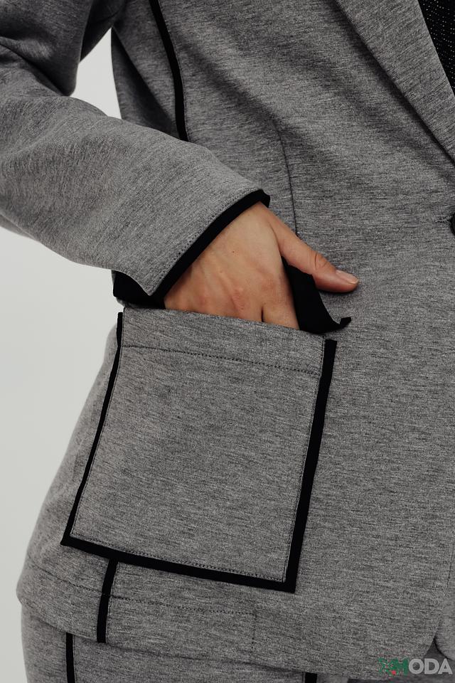 Модель застегивается на одну пуговицу, что добавляет ей классический вид. Воротник жакета лацкановый, что придает ему более строгий и деловой вид. Накладные карманы с черной окантовкой добавляют оригинальности.