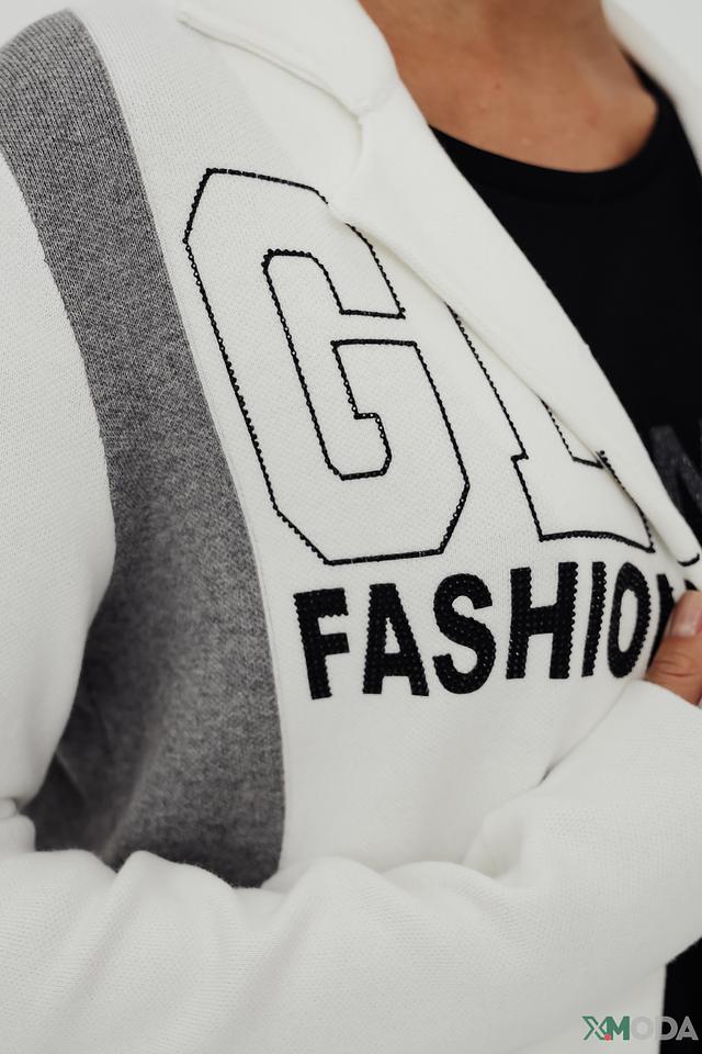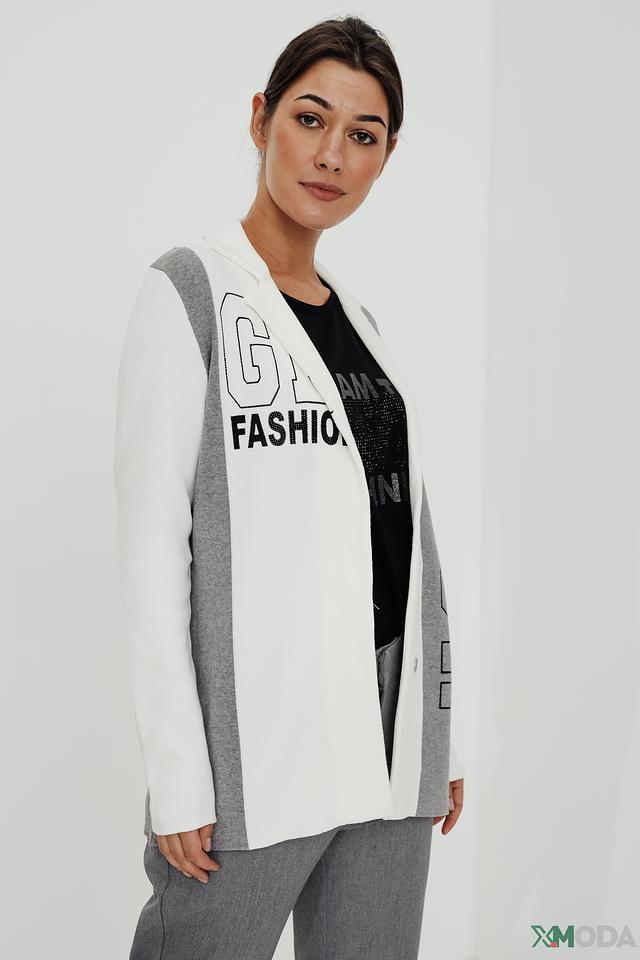 Жакет выполнен в двух цветах: белом и сером. Белые части жакета украшены ярким принтом с надписями и графическими элементами, что придает ему оригинальность и индивидуальность. Серые вставки добавляют контраста и делают образ более интересным.