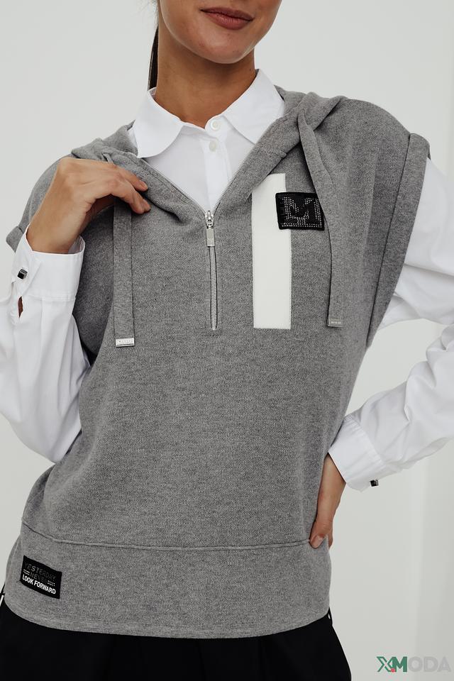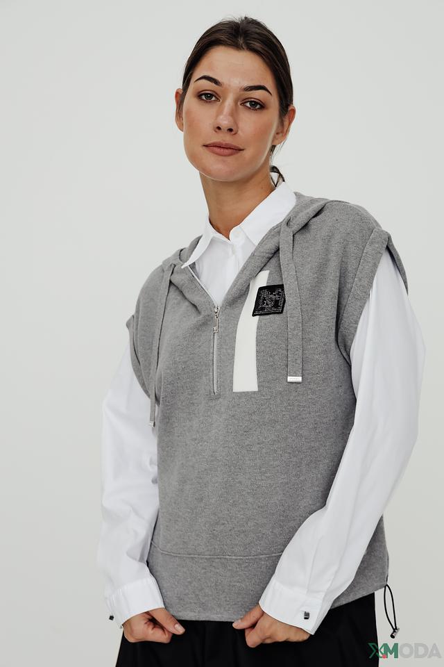 Серый пуловер от Monari – это стильный и удобный выбор для повседневного гардероба. Модель без рукавов с капюшоном и молнией добавит образу динамичности и современности. Изготовлен из 100% хлопка. Состав: хлопок 100%