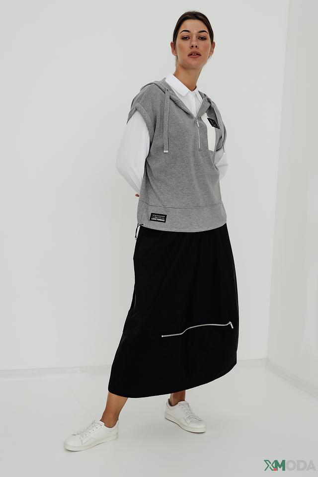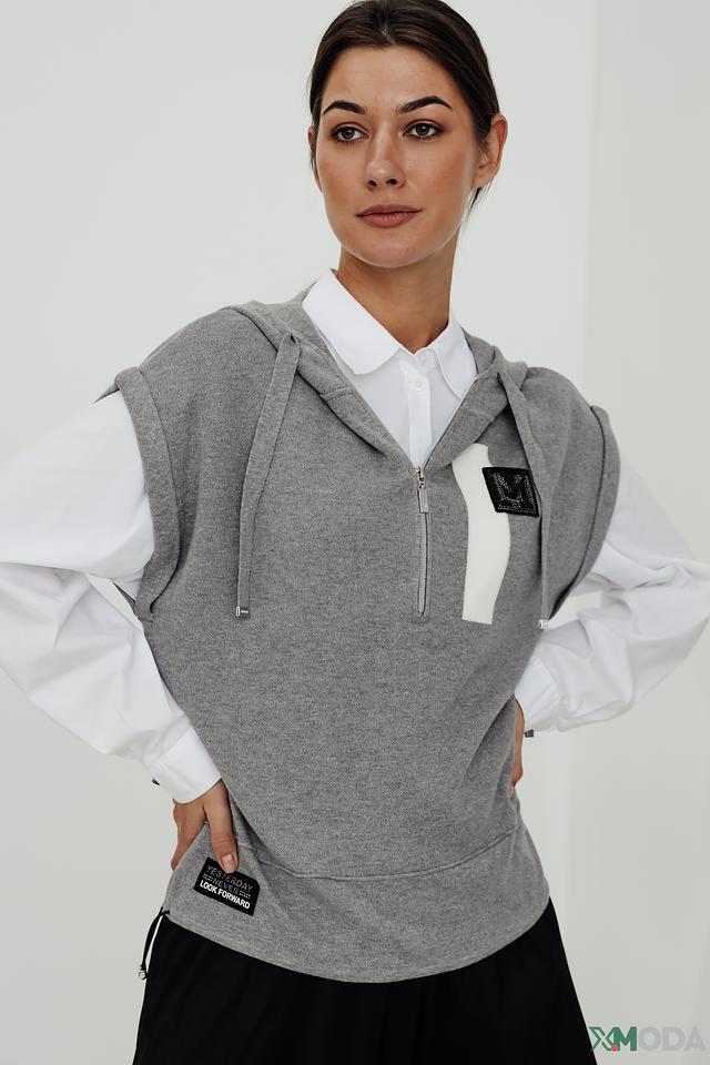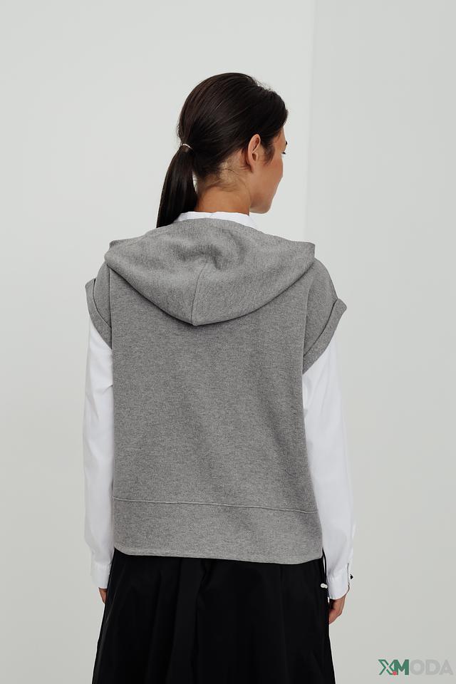 Модель имеет капюшон и короткую молнию, что придает ей современный вид. Отсутствие рукавов делает этот пуловер отличным вариантом для теплой погоды или для создания многослойных образов.