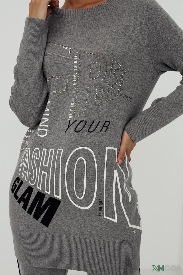 Передняя часть платья украшена крупным принтом с надписями "MIND YOUR FASHION GLAM" и декоративными элементами, выполненными в чёрно-белой гамме. Дополнительный акцент сделан на стразы, которые придают изделию изысканность.