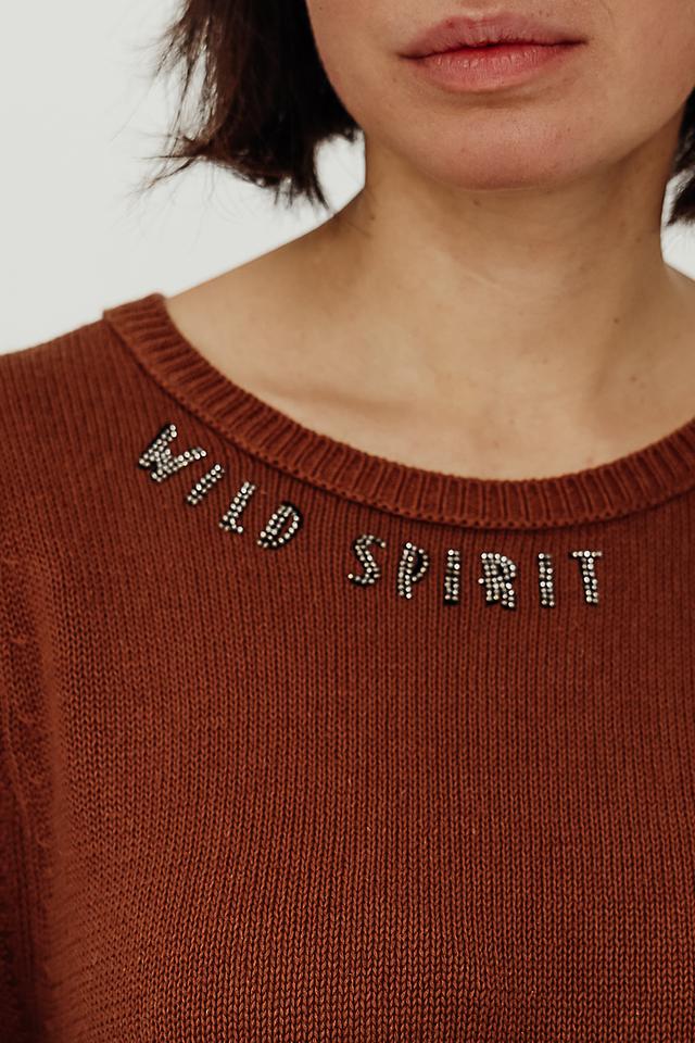 Передняя часть пуловера украшена вышивкой с надписью "Wild Spirit", выполненной в контрастном цвете. Дополнительный декоративный элемент – вышивка "Free Mind" на нижней части изделия. Пуловер имеет круглый вырез горловины.
