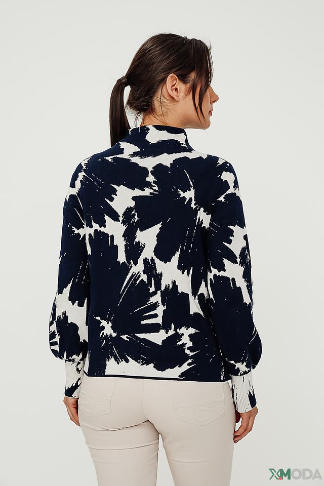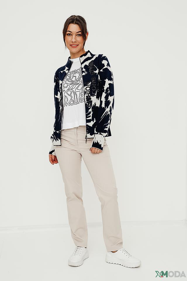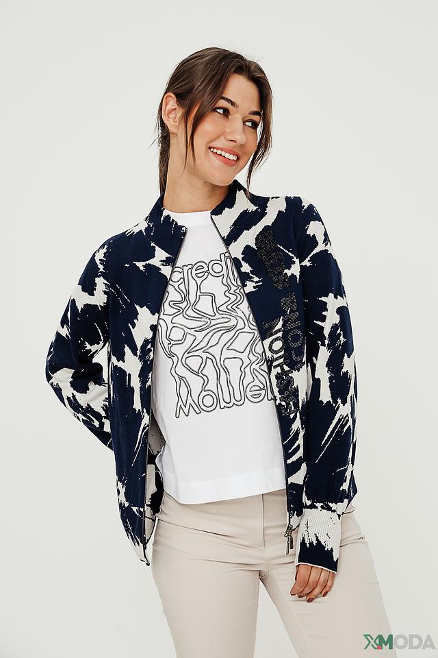 Женский жакет Monari темно-синего цвета с оригинальным абстрактным принтом. Модель на молнии с воротником-стойкой и манжетами в рубчик. Изготовлен из мягкого хлопкового трикотажа. Состав: хлопок 98%, полиамид 2%