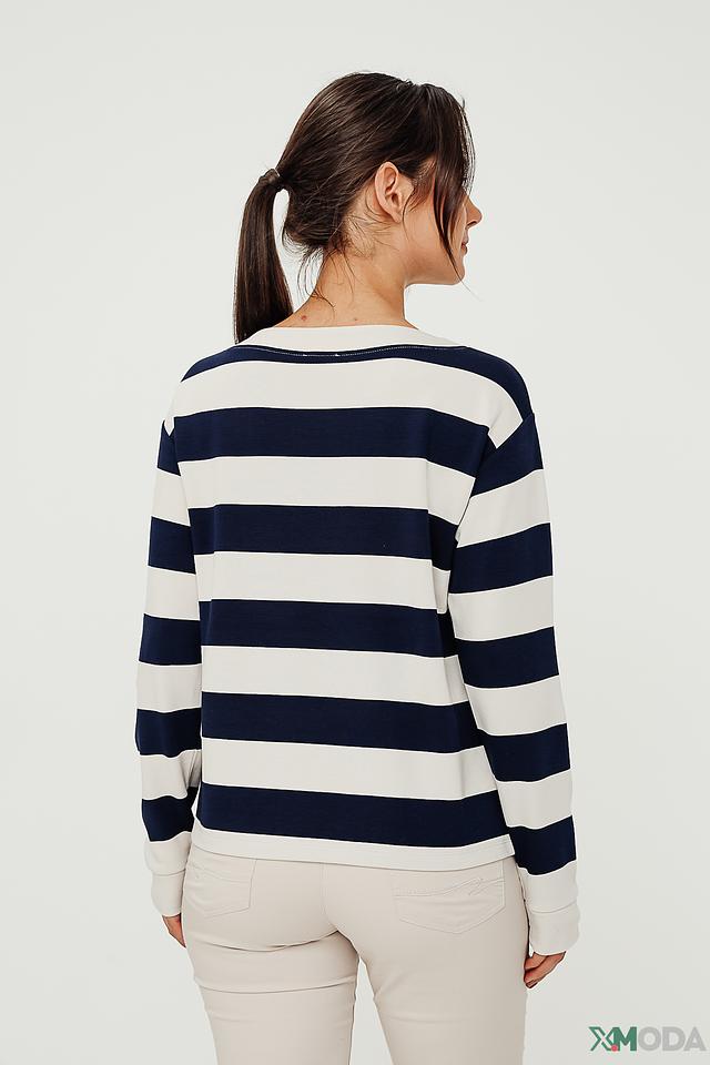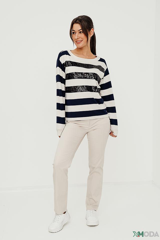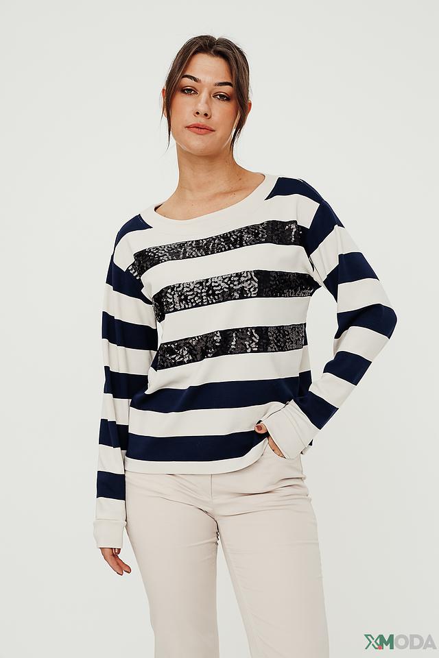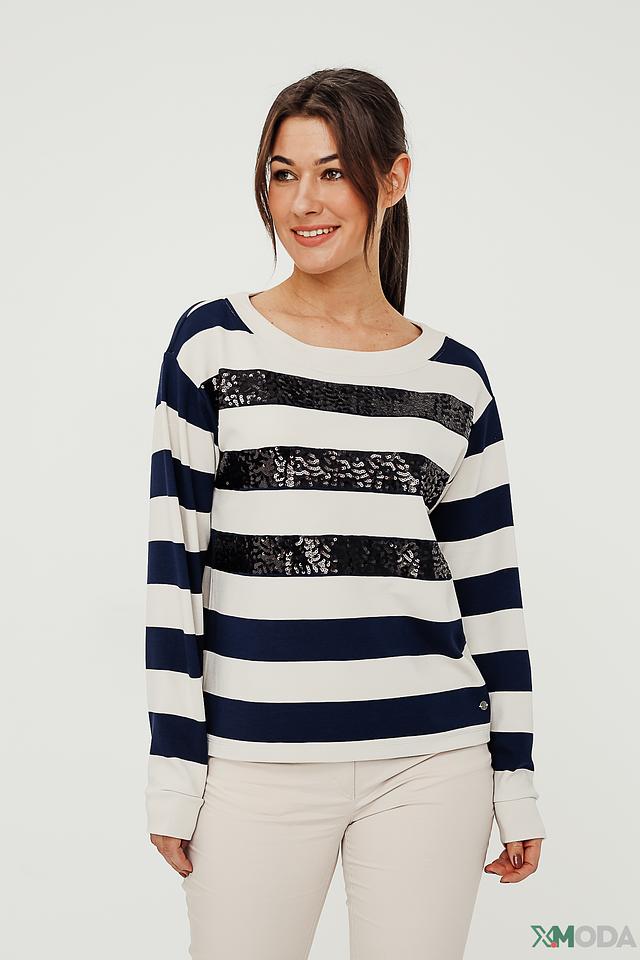 Женский пуловер Monari сине-белого цвета с полосками и декоративными пайетками. Модель имеет удобный крой и выполнена из мягкого и приятного к телу сочетания вискозы, полиэстера и эластана. Состав: вискоза 80%, полиэстер 15%, эластан 5%
