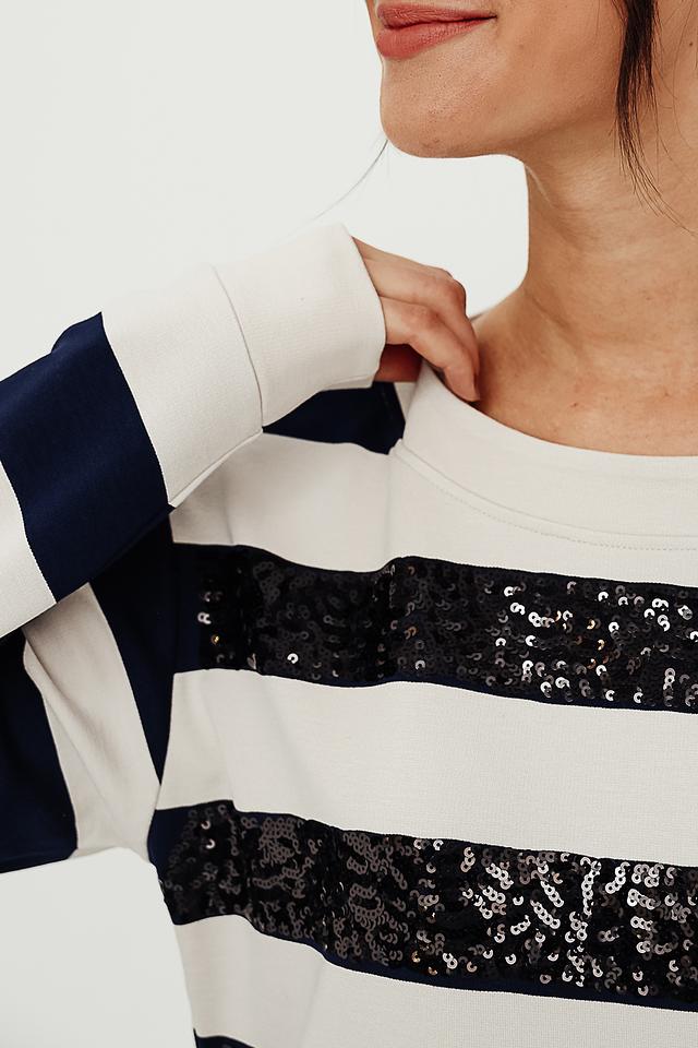 Особый акцент в дизайне пуловера – это вставки из мерцающих пайеток, которые добавляют образу праздничности и блеска. Круглый вырез горловины и длинные рукава обеспечивают комфорт и свободу движений.