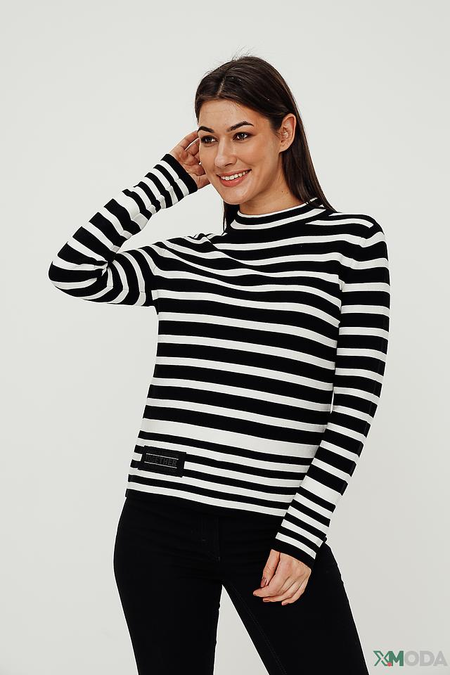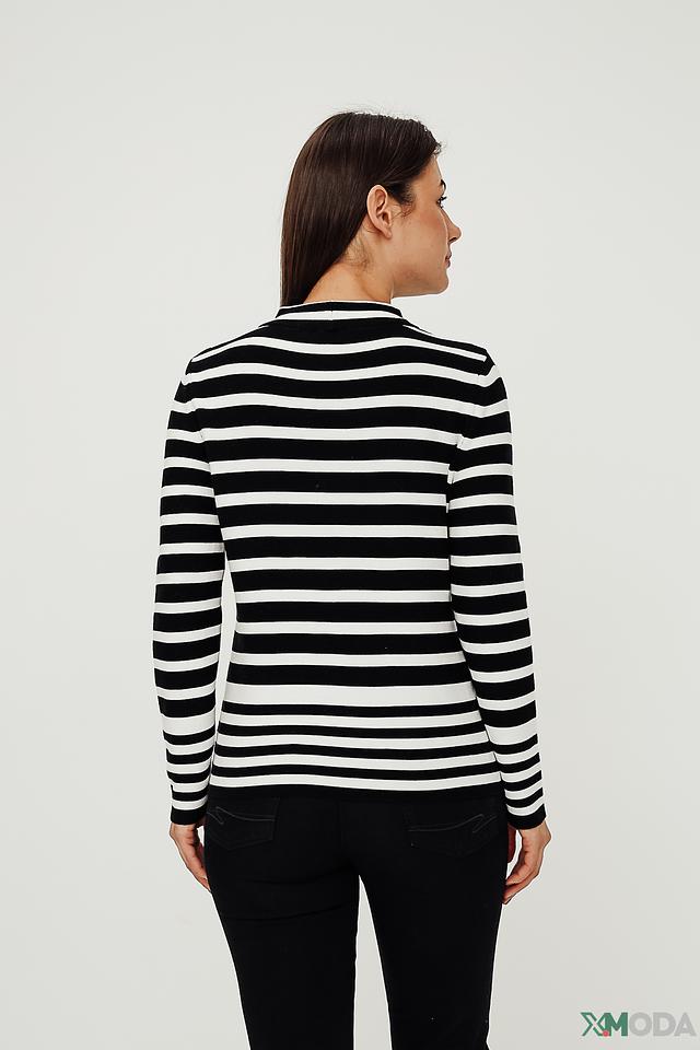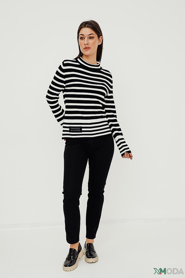 Женский пуловер Monari чёрно-белого цвета с полосатым узором и высоким горлом. Изготовлен из 100% хлопка, обеспечивающего комфорт и удобство в носке. Стильный и универсальный выбор для создания модных образов. Состав: хлопок 100%